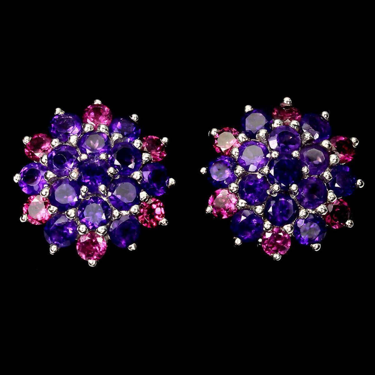925 STERLING SILVER;PLATE-14K WHITE GOLD;MAIN STONE-AMETHYST;OTHER GEMS-RHODOLITE GARNET;TOTAL WEIGHT-9.99 GRAM (TOTAL WEIGHT OF SILVER + STONE)DIMENSION* STONE 3.5 TO 5.0 MM. * FACE EARRINGS 21.0 X 20.0 MM.MAIN STONE SHAPE-ROUND CUT;MAIN STONE COLOR-TOP INTENSE PURPLE;CLARITY/GRADE-IF TO VVS;;TREATMENT-UNHEATED;ORIGIN-Brazil;HARDNESS-7;