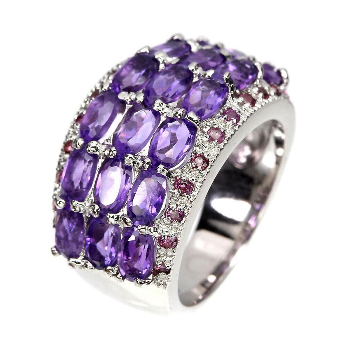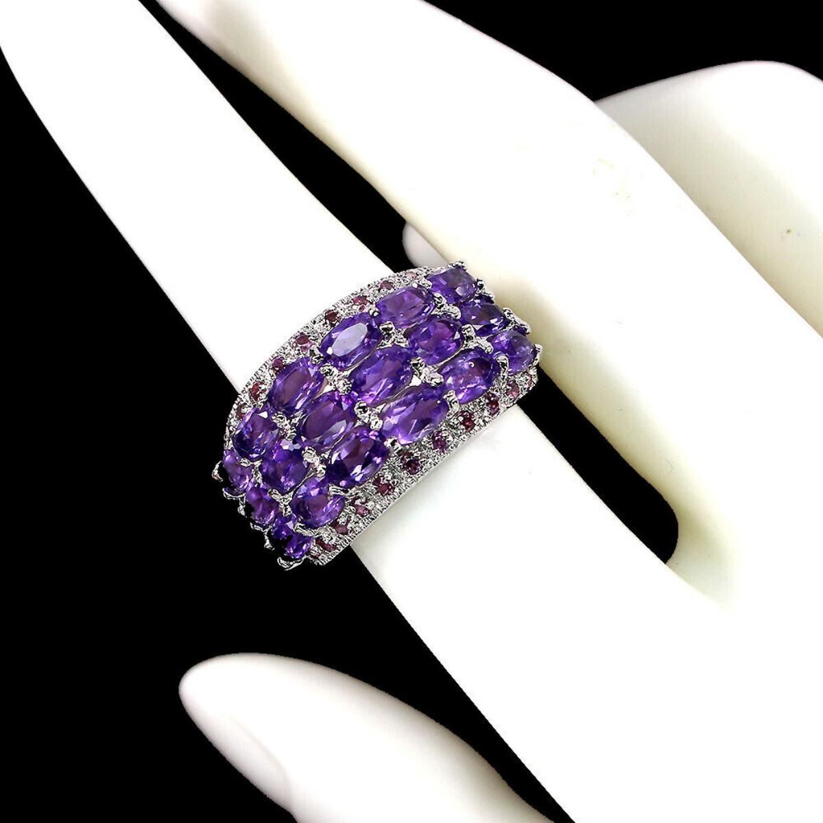 925 STERLING SILVER;PLATE-14K WHITE GOLD;RING SIZE(Resizeable)--7;MAIN STONE-AMETHYST;OTHER GEMS-RHODOLITE GARNET;TOTAL WEIGHT-9.36 GRAM (TOTAL WEIGHT OF SILVER + STONE);DIMENSION-* STONE 1.5 TO 5.0 X 3.0 MM.* RING SIZE 7.0* FACE RING 25.0 X 14.0 MM.;MAIN STONE SHAPE-OVAL;MAIN STONE COLOR- PURPLE;CLARITY/GRADE-IF TO VVS;TREATMENT-UNHEATED;ORIGIN-BRAZIL;HARDNESS-7;