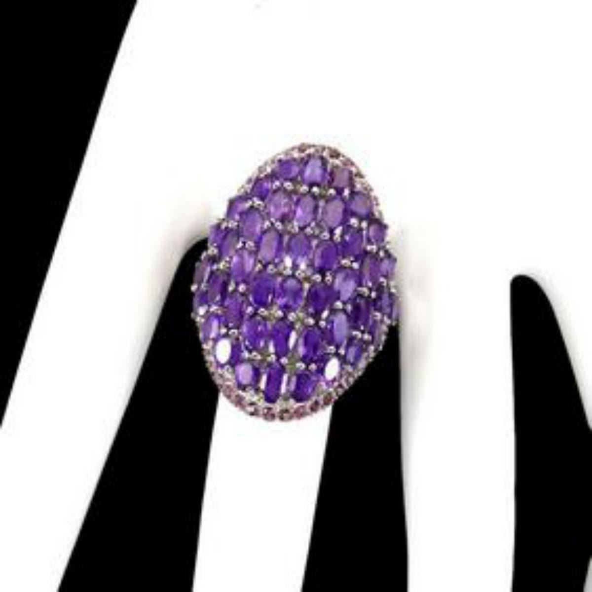 925 STERLING SILVER;PLATE-14K WHITE GOLD;RING SIZE/LENGTH (INCHES)8.5;MAIN STONE-AMETHYST;OTHER GEMS-RHODOLITE GARNET;TOTAL WEIGHT-8.81 GRAM (TOTAL WEIGHT OF SILVER + STONE)DIMENSION-* STONE 1.5 TO 5.0 X 3.0 MM.;* RING- 8.5 SIZE;* FACE RING- 34.0 X 24.0 MM.;MAIN STONE SHAPE-OVAL CUT;MAIN STONE COLOR- PURPLE;CLARITY/GRADE-IF TO VVS;TREATMENT-UNHEATED;ORIGIN-URUGUAY;HARDNESS-7;