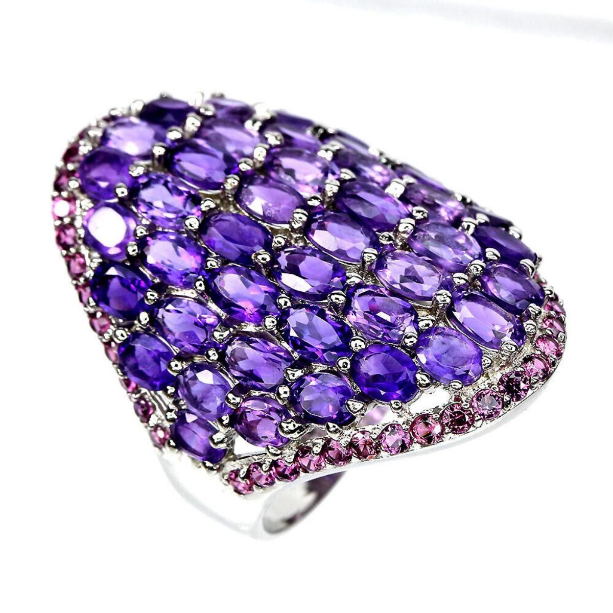 925 STERLING SILVER;PLATE-14K WHITE GOLD;RING SIZE-8.5(RESIZABLE);MAIN STONE-AMETHYST;OTHER GEMS-RHODOLITE GARNET;TOTAL WEIGHT-9.04 GRAM (TOTAL WEIGHT OF SILVER + STONE);DIMENSION-* STONE 1.5 TO 5.0 X 3.0 MM. * RING SIZE 8.5 * FACE RING 33.0 X 25.0 MM.;MAIN STONE SHAPE-OVAL;MAIN STONE COLOR- PURPLE;CLARITY/GRADE-IF TO VVS;TREATMENT-UNHEATED;ORIGIN-BRAZIL;HARDNESS-7;