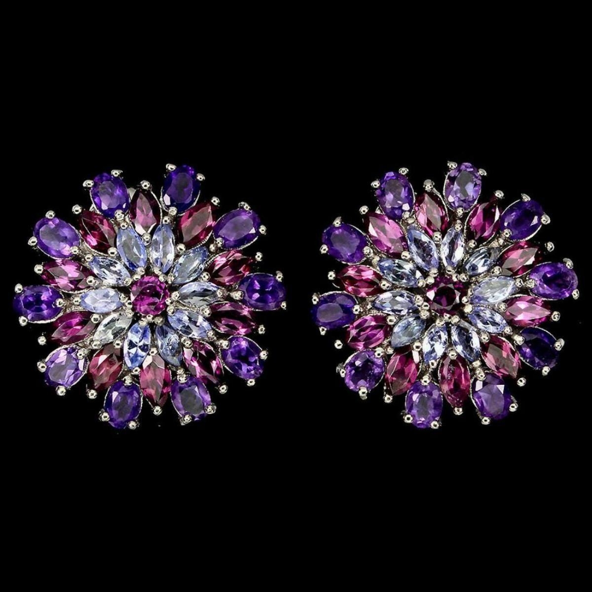 925 STERLING SILVER;PLATE-14K WHITE GOLD;MAIN STONE-AMETHYST;OTHER GEMS-RHODOLITE GARNET, TANZANITE;TOTAL WEIGHT-7.1 GRAM (TOTAL WEIGHT OF SILVER + STONE)DIMENSION-* STONE 3.0 TO 4.0 X 3.0 MM. * FACE EARRINGS 22.0 X 22.0 MM.MAIN STONE SHAPE-OVAL CUT;MAIN STONE COLOR-TOP RICH PURPLE;CLARITY/GRADE-IF TO VVS;TREATMENT-UNHEATED;ORIGIN-BRAZIL;HARDNESS-7;