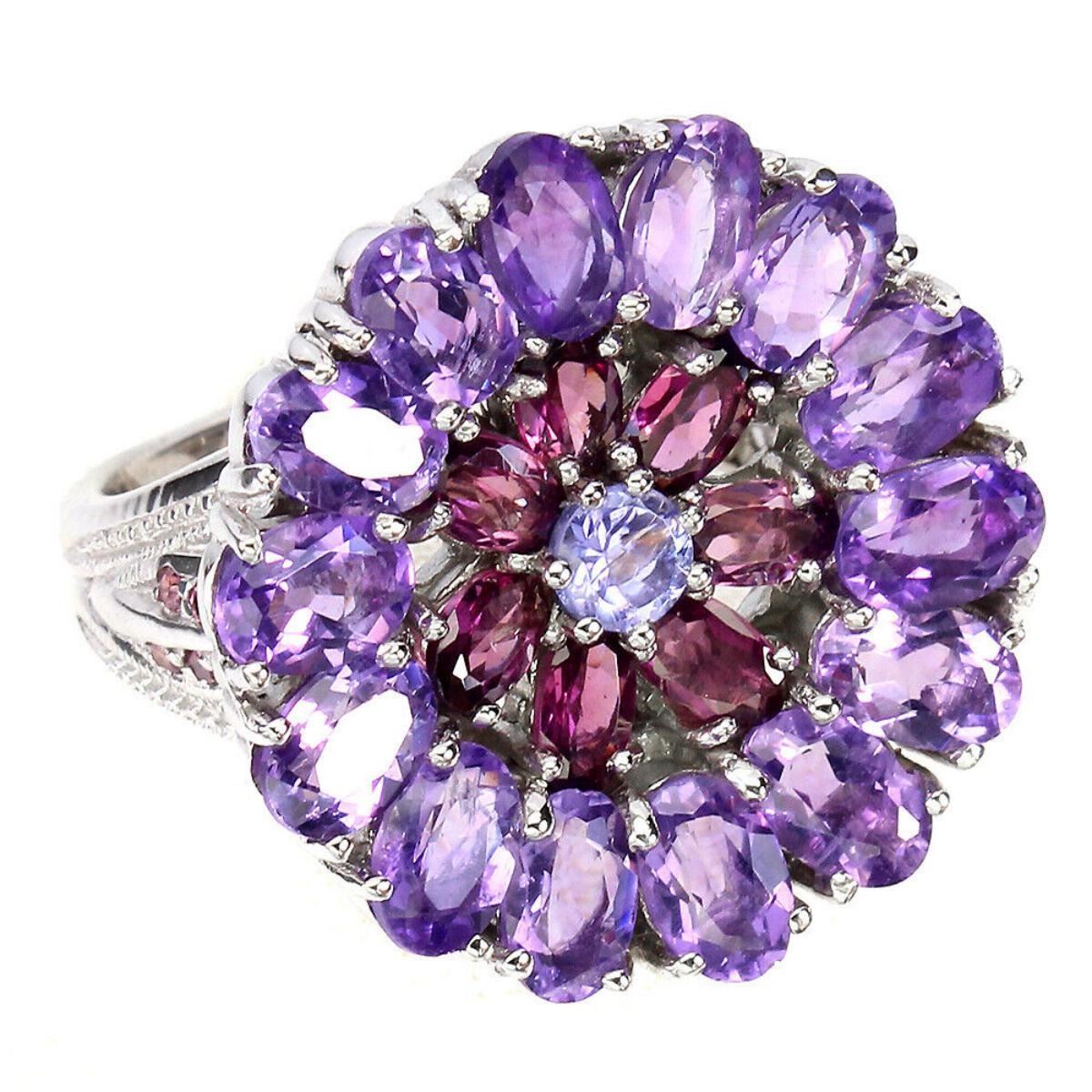 925 STERLING SILVER;PLATE-14K WHITE GOLD;RING SIZE/resizable-8;MAIN STONE-AMETHYST;OTHER GEMS-RHODOLITE GARNET, TANZANITE;TOTAL WEIGHT-12.7 GRAM (TOTAL WEIGHT OF SILVER + STONE)DIMENSION-* STONE 1.0 TO 6.0 X 4.0 MM. * RING SIZE 8.0 * FACE RING -25.0 X 25.0 MM.;MAIN STONE SHAPE-OVAL CUT;MAIN STONE COLOR- PURPLE;CLARITY/GRADE-IF TO VVS;TREATMENT-UNHEATED;ORIGIN-URUGUAY;HARDNESS-7;