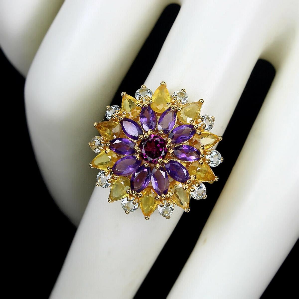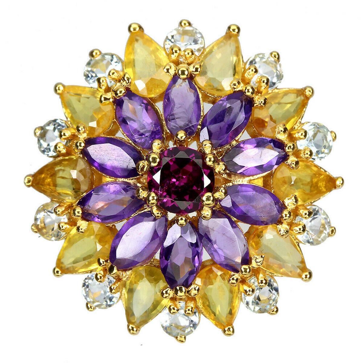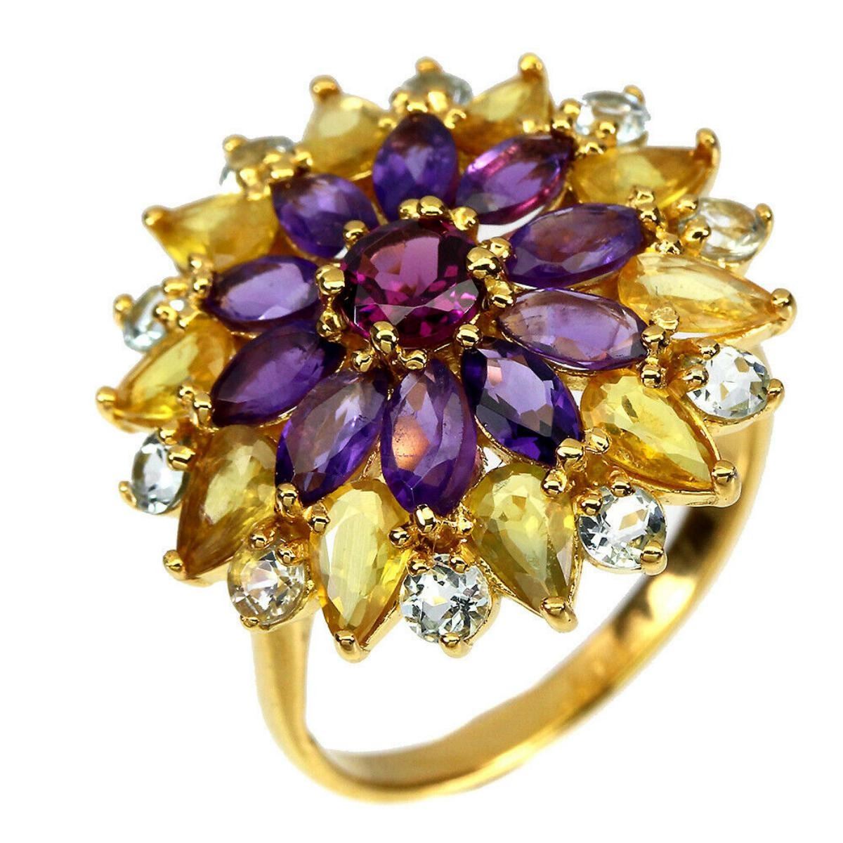 925 STERLING SILVER;PLATE-14K YELLOW GOLD;RING SIZE/resizeable7.5;MAIN STONE-AMETHYST;OTHER GEMS-AQUAMARINE, RHODOLITE GARNET, SAPPHIRE;TOTAL WEIGHT-4.45 GRAM (TOTAL WEIGHT OF SILVER + STONE)DIMENSION-* STONE 2.5 TO 5.0 X 3.0 MM.;* RING SIZE- 7.5;* FACE RING- 22.0 X 22.0 MM.;MAIN STONE SHAPE-MARQUISE CUT;MAIN STONE COLOR- RICH PURPLE;CLARITY/GRADE-IF;TREATMENT-UNHEATED;ORIGIN-URUGUAY;HARDNESS-7