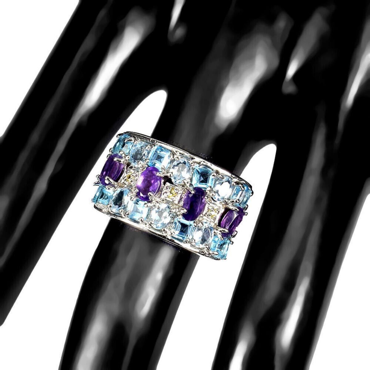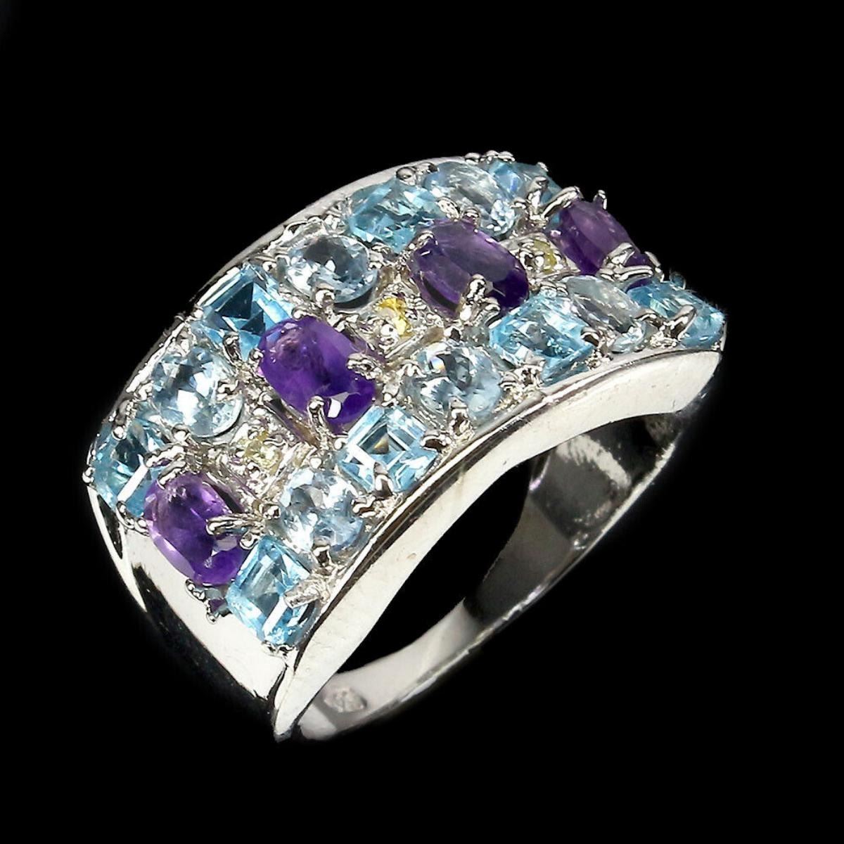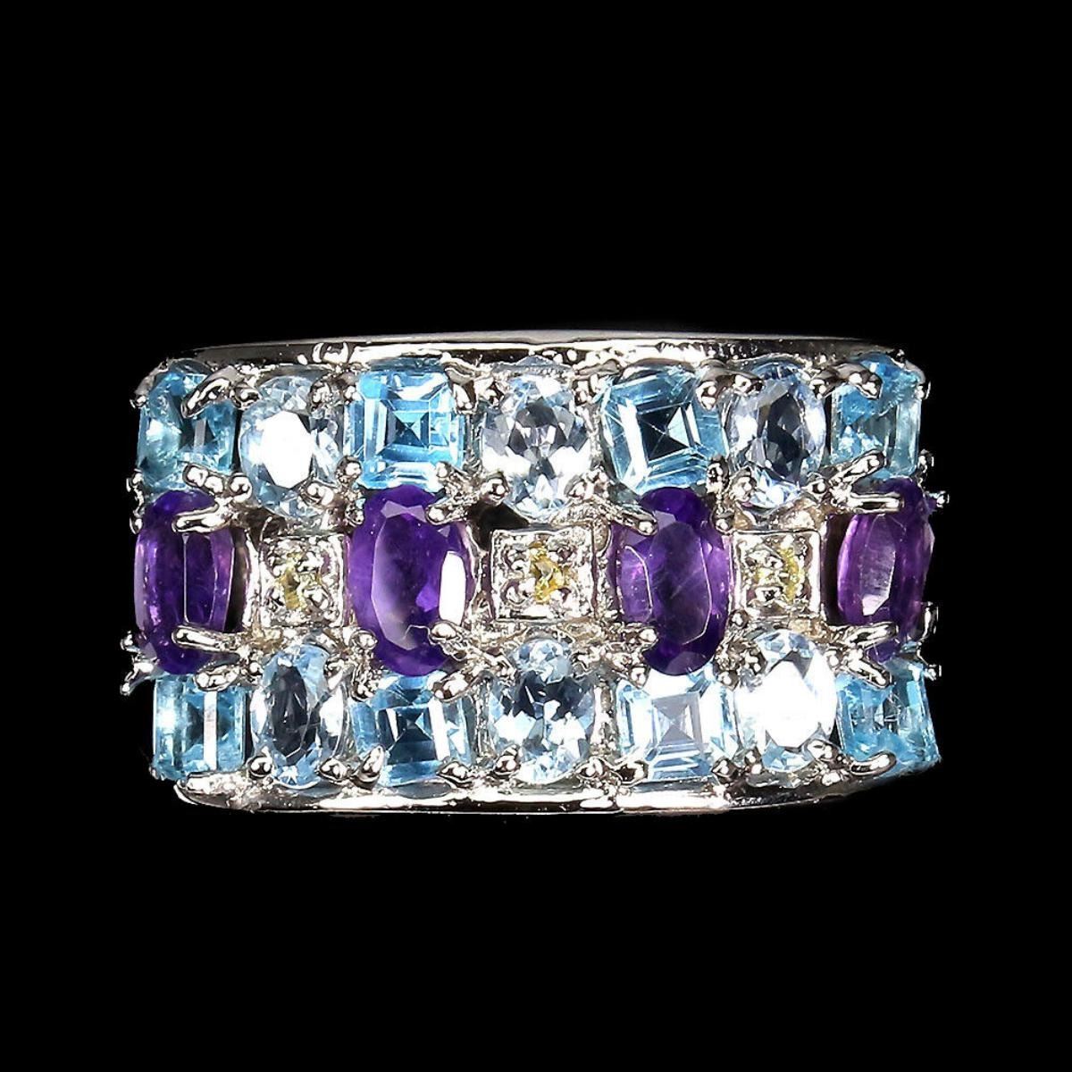 925 STERLING SILVER;PLATE-14K WHITE GOLD;RING SIZE -7(RESIZABLE);MAIN STONE-AMETHYST;OTHER GEMS-SAPPHIRE, SWISS BLUE TOPAZ;TOTAL WEIGHT-5.4 GRAM (TOTAL WEIGHT OF SILVER + STONE);DIMENSION-* STONE 1.0 TO 5.0 X 3.0 MM.* RING SIZE 7.0* FACE RING 22.0 X 14.0 MM.;MAIN STONE SHAPE-OVAL;MAIN STONE COLOR- PURPLE;CLARITY/GRADE-IF TO VVS;TREATMENT-UNHEATED;ORIGIN-URUGUAY;HARDNESS-7;