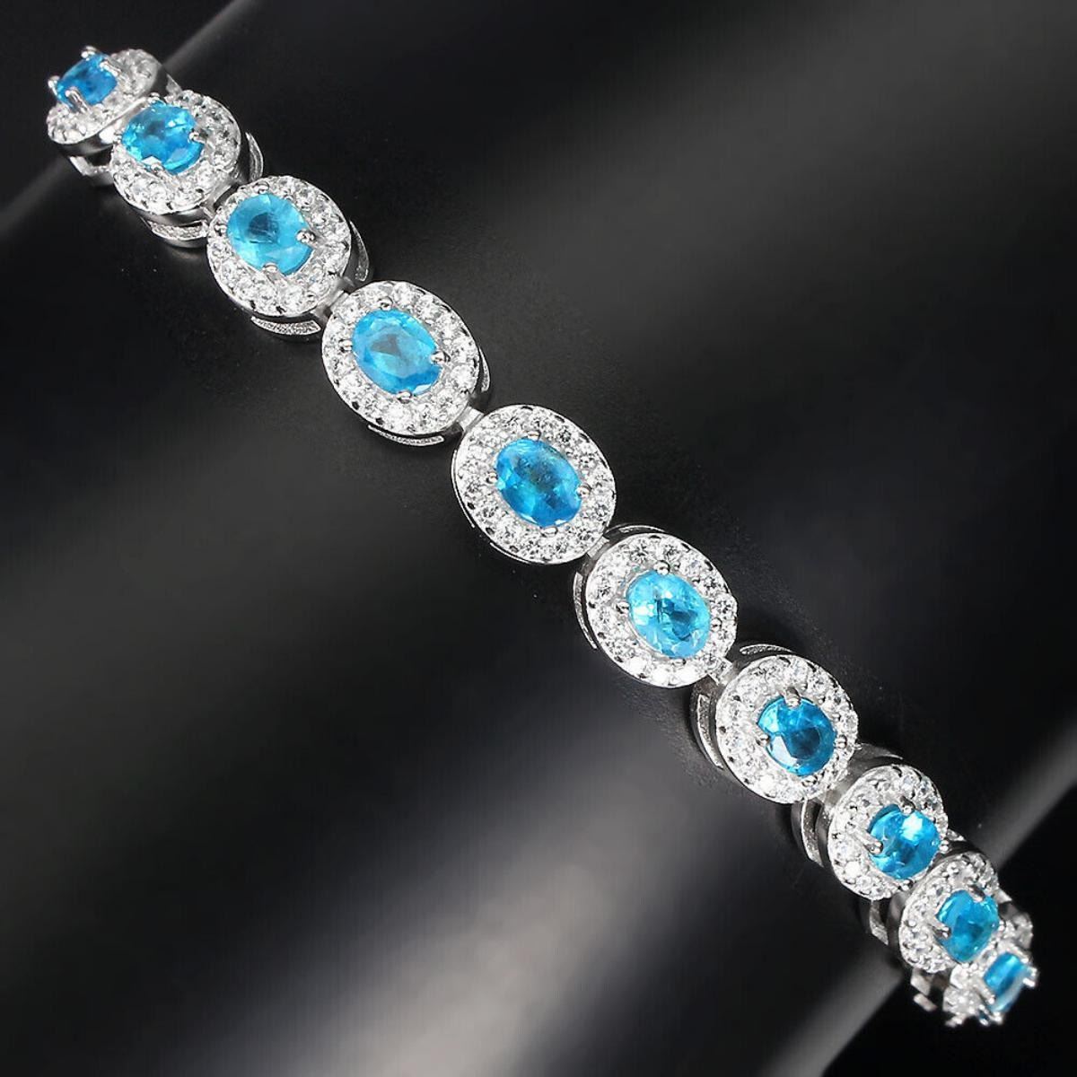 925 STERLING SILVER;PLATE-14K WHITE GOLD;LENGTH (INCHES)-7;MAIN STONE-APATITE;TOTAL WEIGHT-6.67 GRAM (TOTAL WEIGHT OF SILVER + STONE);DIMENSION-* STONE 4.0 X 3.0 MM.* TOTAL LENGTH 7.0 INCHES.* FACE BRACELET 80.0 X 6.0 MM.;MAIN STONE SHAPE-OVAL;MAIN STONE COLOR-NEON BLUE;CLARITY/GRADE-IF TO VVS;TREATMENT-UNHEATED;ORIGIN-AFRICA;HARDNESS-5;