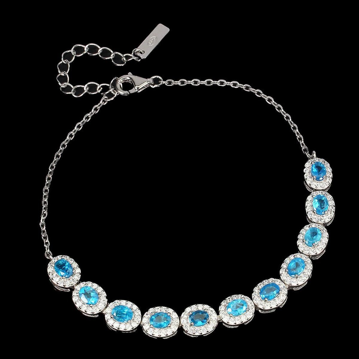 925 STERLING SILVER;PLATE-14K WHITE GOLD;LENGTH (INCHES)-7;MAIN STONE-APATITE;TOTAL WEIGHT-6.67 GRAM (TOTAL WEIGHT OF SILVER + STONE);DIMENSION-* STONE 4.0 X 3.0 MM.* TOTAL LENGTH 7.0 INCHES.* FACE BRACELET 80.0 X 6.0 MM.;MAIN STONE SHAPE-OVAL;MAIN STONE COLOR-NEON BLUE;CLARITY/GRADE-IF TO VVS;TREATMENT-UNHEATED;ORIGIN-AFRICA;HARDNESS-5;