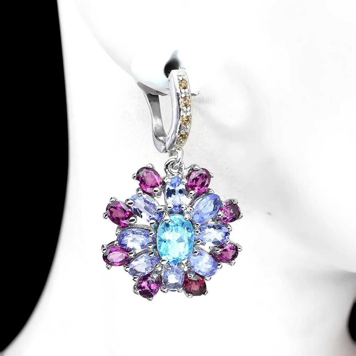 925 STERLING SILVER;PLATE-14K WHITE GOLD;MAIN STONE-APATITEOTHER GEMS-RHODOLITE GARNET, SAPPHIRE, TANZANITETOTAL WEIGHT-6.55 GRAM (TOTAL WEIGHT OF SILVER + STONE)DIMENSION-* STONE 1.5 TO 7.0 X 5.0 MM. * FACE EARRINGS 32.0 X 20.0 MM.MAIN STONE SHAPE-OVAL CUT;MAIN STONE COLOR- BLUE;CLARITY/GRADE-IF TO VVS;TREATMENT-UNHEATED;ORIGIN-AFRICA;HARDNESS-5;