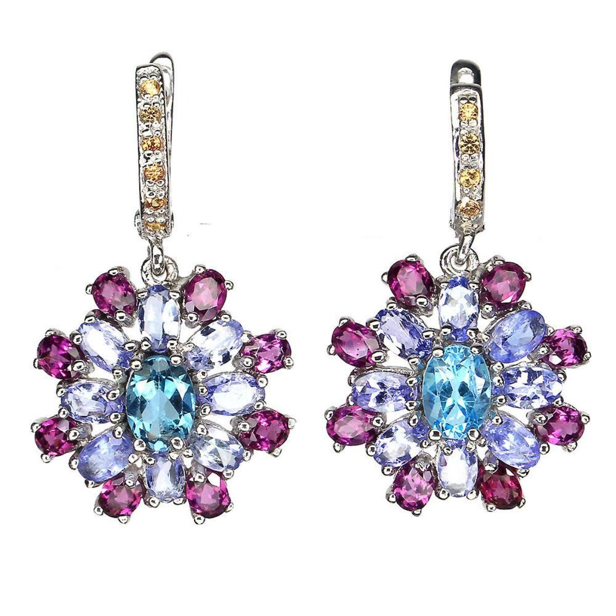 925 STERLING SILVER;PLATE-14K WHITE GOLD;MAIN STONE-APATITEOTHER GEMS-RHODOLITE GARNET, SAPPHIRE, TANZANITETOTAL WEIGHT-6.55 GRAM (TOTAL WEIGHT OF SILVER + STONE)DIMENSION-* STONE 1.5 TO 7.0 X 5.0 MM. * FACE EARRINGS 32.0 X 20.0 MM.MAIN STONE SHAPE-OVAL CUT;MAIN STONE COLOR- BLUE;CLARITY/GRADE-IF TO VVS;TREATMENT-UNHEATED;ORIGIN-AFRICA;HARDNESS-5;