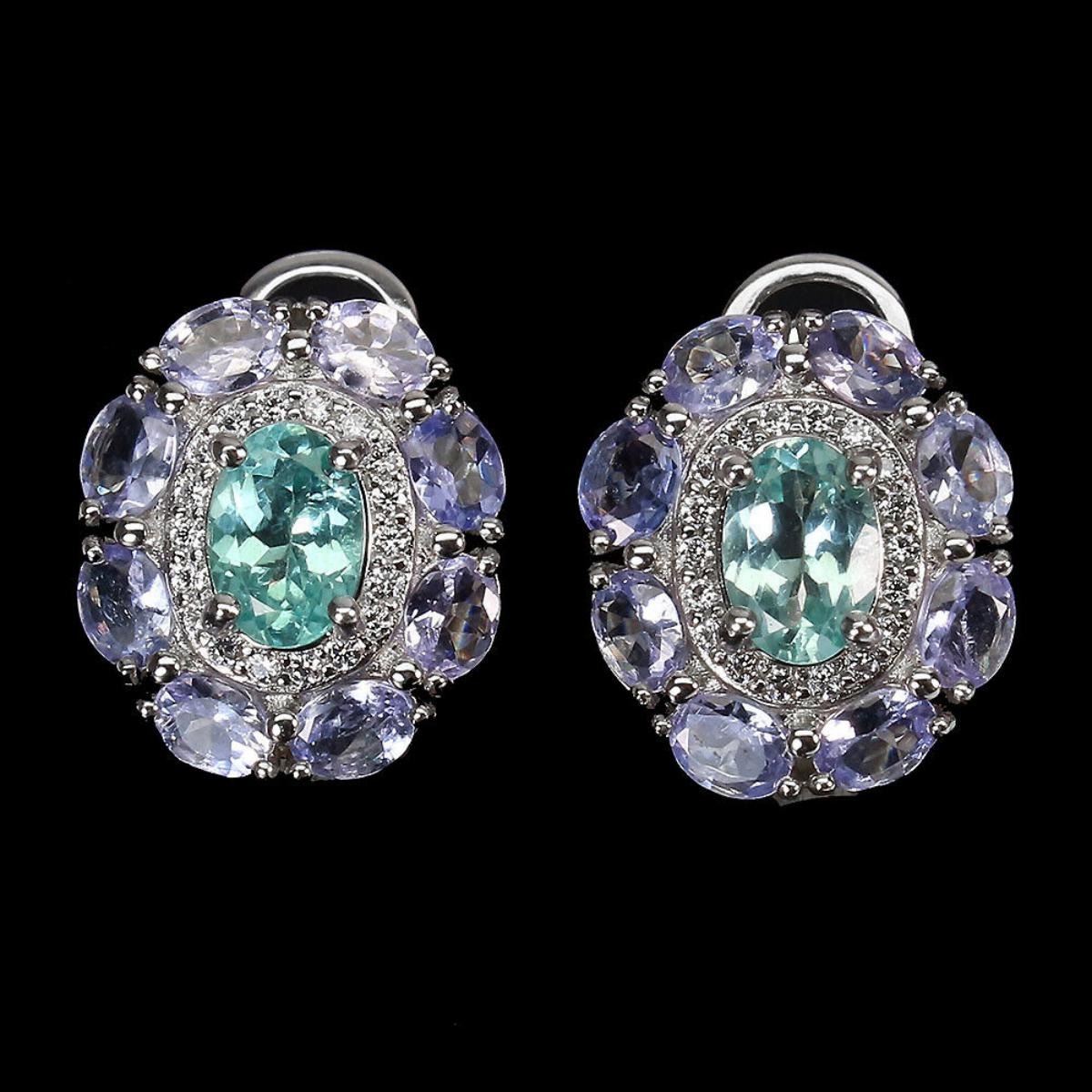 925 STERLING SILVER;PLATE-14K WHITE GOLD;MAIN STONE-APATITE;OTHER GEMS- TANZANITE;TOTAL WEIGHT-6.19 GRAM (TOTAL WEIGHT OF SILVER + STONE)DIMENSION-* STONE 4.0 X 3.0 TO 7.0 X 5.0 MM. * CZ 1.0 MM. * FACE EARRINGS -15.0 X 13.0 MM.;MAIN STONE SHAPE-OVAL CUT;MAIN STONE COLOR-NEON BLUE;CLARITY/GRADE-IF TO VVS;TREATMENT-UNHEATED;ORIGIN-AFRICA;HARDNESS-5;