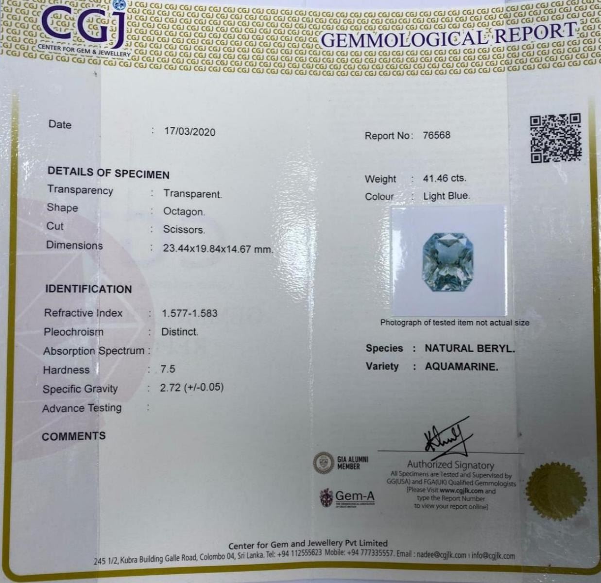 Natural Aquamarine 41.46 Carats - completely Untreated .....size 23.44 x 19.84 x 14.67 MM ; Shape - Emerald cut.....VVS Clarity; Hardness 7.5; Certified; Origin - Brazil