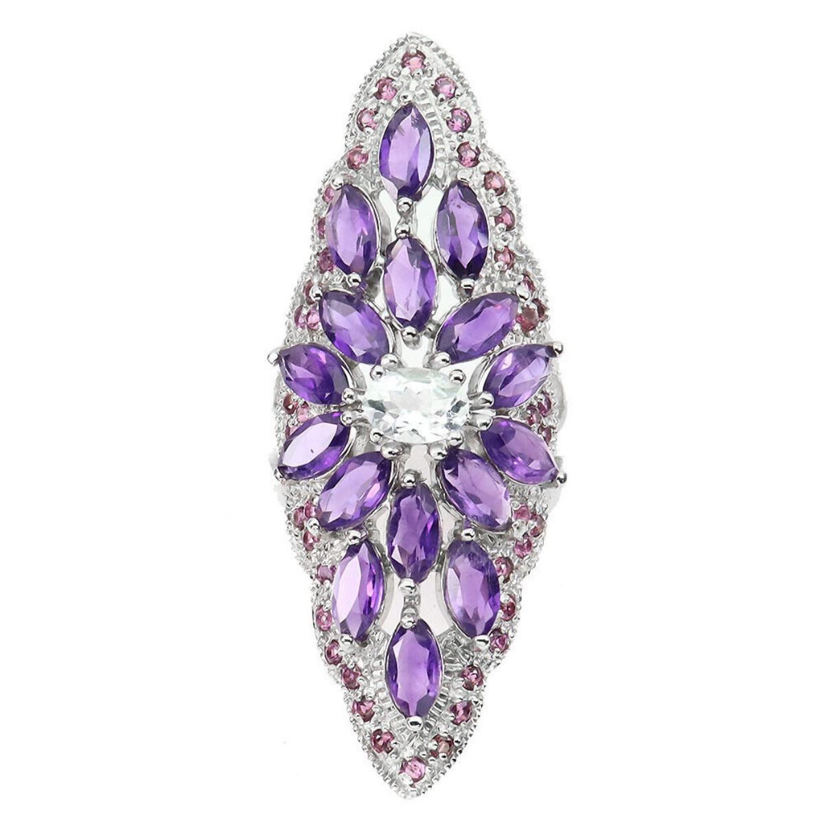 925 STERLING SILVER;PLATE-14K WHITE GOLD;RING SIZE-9(RESIZABLE);MAIN STONE-AQUAMARINE;OTHER GEMS-AMETHYST, RHODOLITE GARNET;TOTAL WEIGHT-11.03 GRAM (TOTAL WEIGHT OF SILVER + STONE);DIMENSION-* STONE 1.5 TO 7.0 X 5.0 MM.* RING SIZE 9.0* FACE RING 52.0 X 19.0 MM.;MAIN STONE SHAPE-OVAL ;MAIN STONE COLOR- BLUE;CLARITY/GRADE-IF TO VVS;TREATMENT-UNHEATED;ORIGIN-BRAZIL;HARDNESS-7;