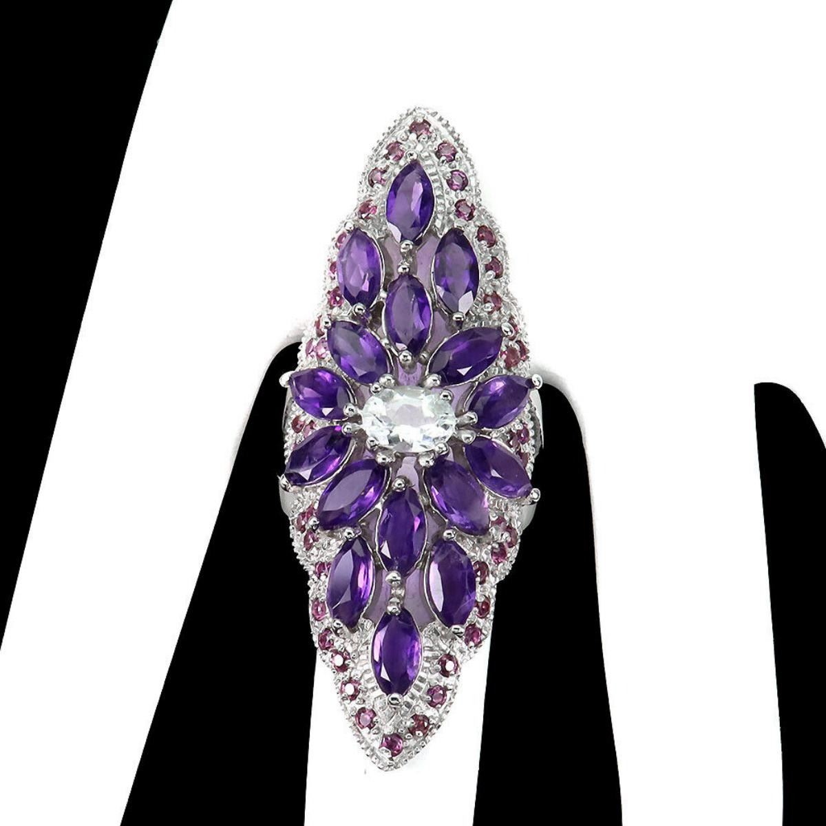 925 STERLING SILVER;PLATE-14K WHITE GOLD;RING SIZE-9(RESIZABLE);MAIN STONE-AQUAMARINE;OTHER GEMS-AMETHYST, RHODOLITE GARNET;TOTAL WEIGHT-11.03 GRAM (TOTAL WEIGHT OF SILVER + STONE);DIMENSION-* STONE 1.5 TO 7.0 X 5.0 MM.* RING SIZE 9.0* FACE RING 52.0 X 19.0 MM.;MAIN STONE SHAPE-OVAL ;MAIN STONE COLOR- BLUE;CLARITY/GRADE-IF TO VVS;TREATMENT-UNHEATED;ORIGIN-BRAZIL;HARDNESS-7;