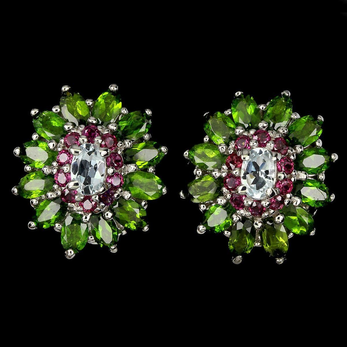 EARRINGS....TYPE OF METAL925 STERLING SILVER;PLATE14K WHITE GOLD;-MAIN STONE-AQUAMARINE;OTHER GEMS-CHROME DIOPSIDE, RHODOLITE GARNET;TOTAL WEIGHT-9.33 GRAM (TOTAL WEIGHT OF SILVER + STONE)DIMENSION-* STONE 2.0 TO 6.0 X 4.0 MM. * FACE EARRINGS 20.0 X 18.0 MM.;MAIN STONE SHAPE-OVAL CUT;MAIN STONE COLOR-TOP NICE BLUE;CLARITY/GRADE-IF TO VVS;TREATMENT-UNHEATED;ORIGIN-SANTA - MARIA;HARDNESS-7;