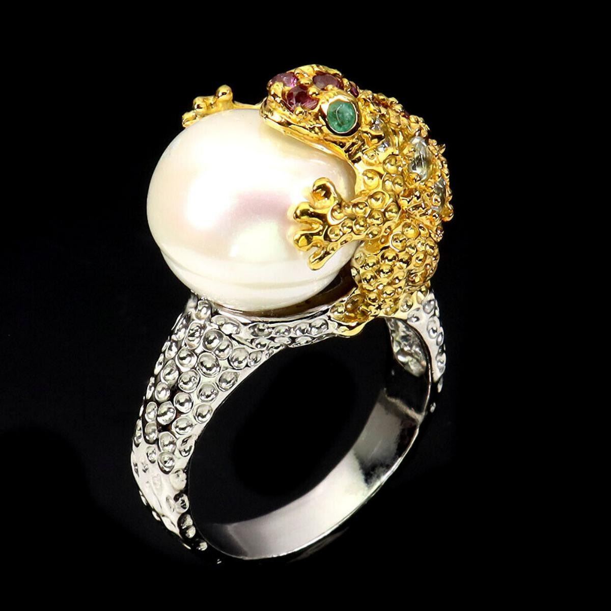 925 STERLING SILVER;PLATE-2-TONE WHITE & YELLOW 14K GOLD;RING SIZE-7.5(RESIZABLE);MAIN STONE-AQUAMARINE;OTHER GEMS-EMERALD, PEARL, RHODOLITE GARNET;TOTAL WEIGHT-8.86 GRAM (TOTAL WEIGHT OF SILVER + STONE);DIMENSION-* STONE 2.0 TO 3.0 MM. * PEARL 11.0 MM. * RING SIZE 8.5 * FACE RING 18.0 X 14.0 MM.;MAIN STONE SHAPE-ROUND ;MAIN STONE COLOR-BLUE;CLARITY/GRADE-IF TO VVS;TREATMENT-UNHEATED;ORIGIN-BRAZIL;HARDNESS-7;