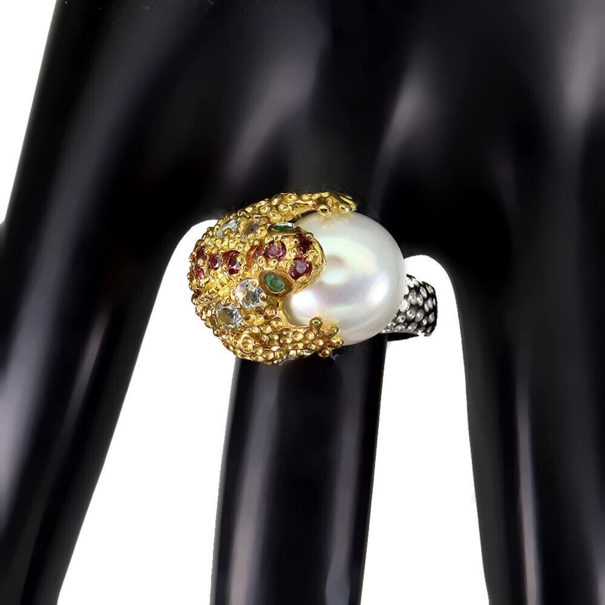 925 STERLING SILVER;PLATE-2-TONE WHITE & YELLOW 14K GOLD;RING SIZE-7.5(RESIZABLE);MAIN STONE-AQUAMARINE;OTHER GEMS-EMERALD, PEARL, RHODOLITE GARNET;TOTAL WEIGHT-8.86 GRAM (TOTAL WEIGHT OF SILVER + STONE);DIMENSION-* STONE 2.0 TO 3.0 MM. * PEARL 11.0 MM. * RING SIZE 8.5 * FACE RING 18.0 X 14.0 MM.;MAIN STONE SHAPE-ROUND ;MAIN STONE COLOR-BLUE;CLARITY/GRADE-IF TO VVS;TREATMENT-UNHEATED;ORIGIN-BRAZIL;HARDNESS-7;