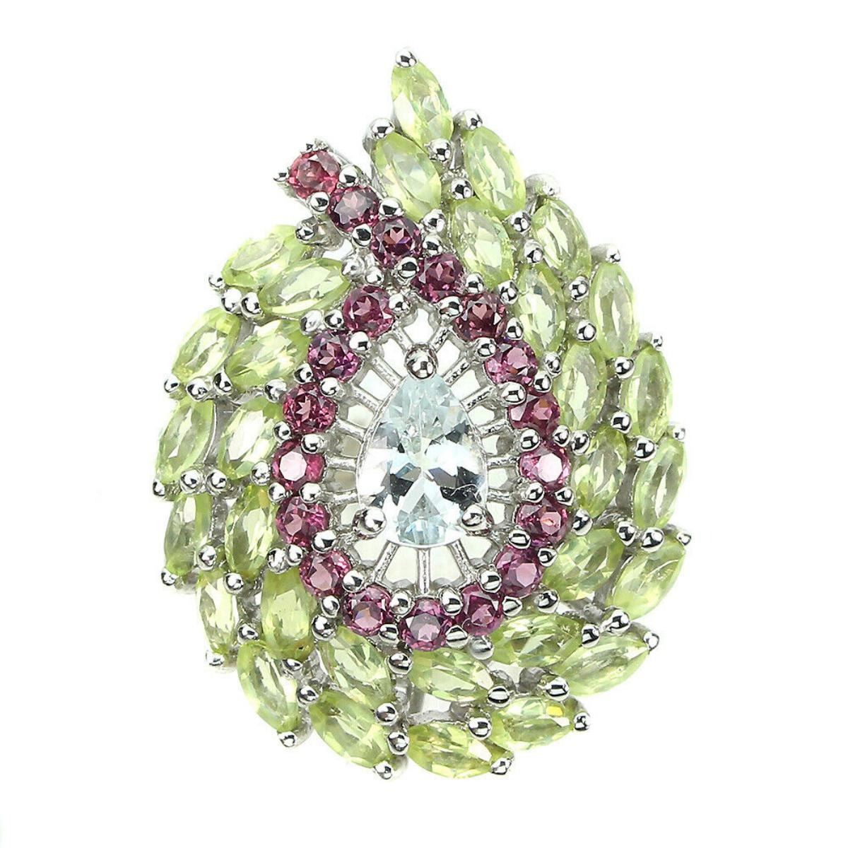 925 STERLING SILVER;PLATE-14K WHITE GOLD;RING SIZE/Resizeable-8;MAIN STONE-AQUAMARINE;OTHER GEMS-PERIDOT, RHODOLITE GARNET;TOTAL WEIGHT-6.42 GRAM (TOTAL WEIGHT OF SILVER + STONE)DIMENSION-* STONE 2.0 TO 7.0 X 5.0 MM.;* FACE RING- 29.0 X 21.0 MM.;MAIN STONE SHAPE-PEAR CUT;CLARITY/GRADE-IF TO VVS;TREATMENT-UNHEATED;ORIGIN-SANTA - MARIA;HARDNESS-7;