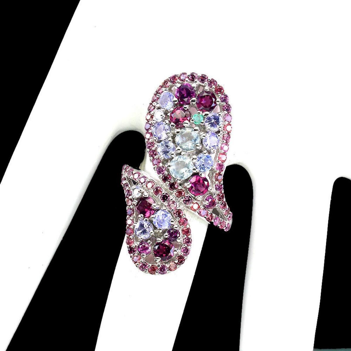 925 STERLING SILVER;PLATE-14K WHITE GOLD;RING SIZE-8.5(RESIZABLE);MAIN STONE-AQUAMARINE;OTHER GEMS-EMERALD, RHODOLITE GARNET, TANZANITE;TOTAL WEIGHT-6.15 GRAM (TOTAL WEIGHT OF SILVER + STONE);DIMENSION-* STONE 1.5 TO 4.0 MM.* RING SIZE 8.5* FACE RING 35.0 X 20.0 MM.;MAIN STONE SHAPE-ROUND ;MAIN STONE COLOR-BLUE;CLARITY/GRADE-IF TO VVS;TREATMENT-UNHEATED;ORIGIN-BRAZIL;HARDNESS-7;