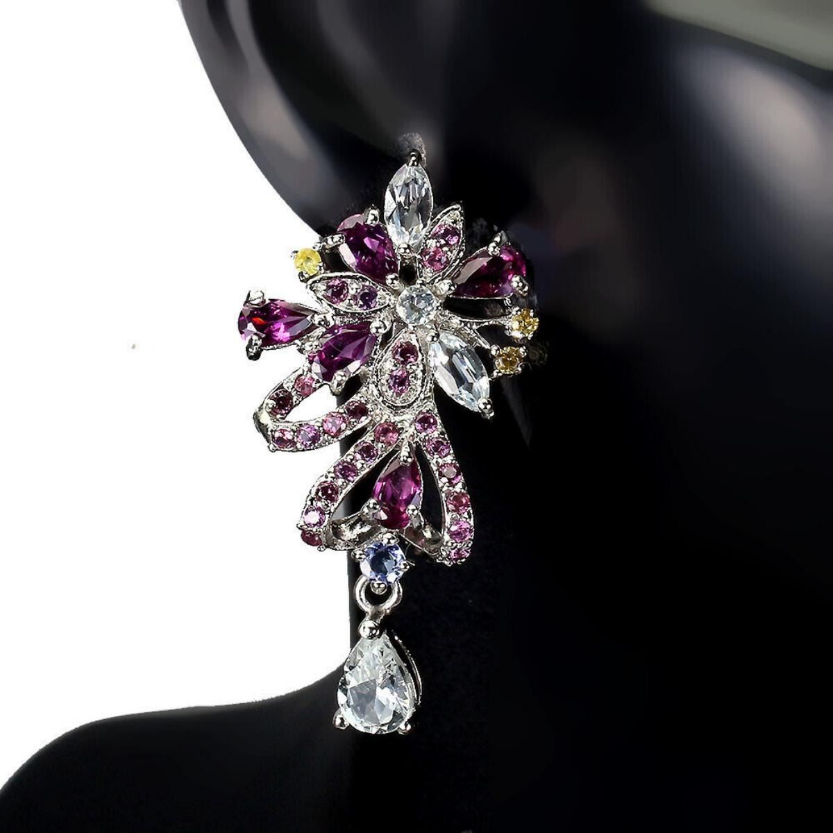 925 STERLING SILVER;PLATE-14K WHITE GOLD;MAIN STONE-AQUAMARINE;OTHER GEMS-RHODOLITE GARNET, SAPPHIRE, TANZANITE;TOTAL WEIGHT-9.26 GRAM (TOTAL WEIGHT OF SILVER + STONE);DIMENSION-* STONE 1.5 TO 7.0 X 5.0 MM.* FACE EARRINGS 37.0 X 19.0 MM.;MAIN STONE SHAPE-PEAR; MAIN STONE COLOR-BLUE;CLARITY/GRADE-IF TO VVS;TREATMENT-UNHEATED;ORIGIN-BRAZIL;HARDNESS-7;