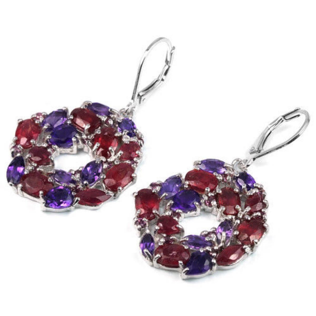 GENUINE RED RUBY & PURPLE AMETHYST 925 SILVER EARRING 14K WHITE GOLD COATING; STONE SHAPEMIXED SHAPESTONE DIMENSION6 X 4 MM. , 6 X 3 MM. , 5 X 4 MM. , 5 X 2.5 MM. , 4 X 3 MM. & 1.7 MM.ITEM WEIGHT11.3 GRAMCOLORRED & PURPLECLARITYIF, VVS&TRANSLUCENTLUSTERALLURINGTREATMENTUNHEATED & HEATEDORIGIN OF STONEBRAZIL & AFRICAHARDNESS7.0 - 9.0;FACE OF EARRING 40 X 23 MM.