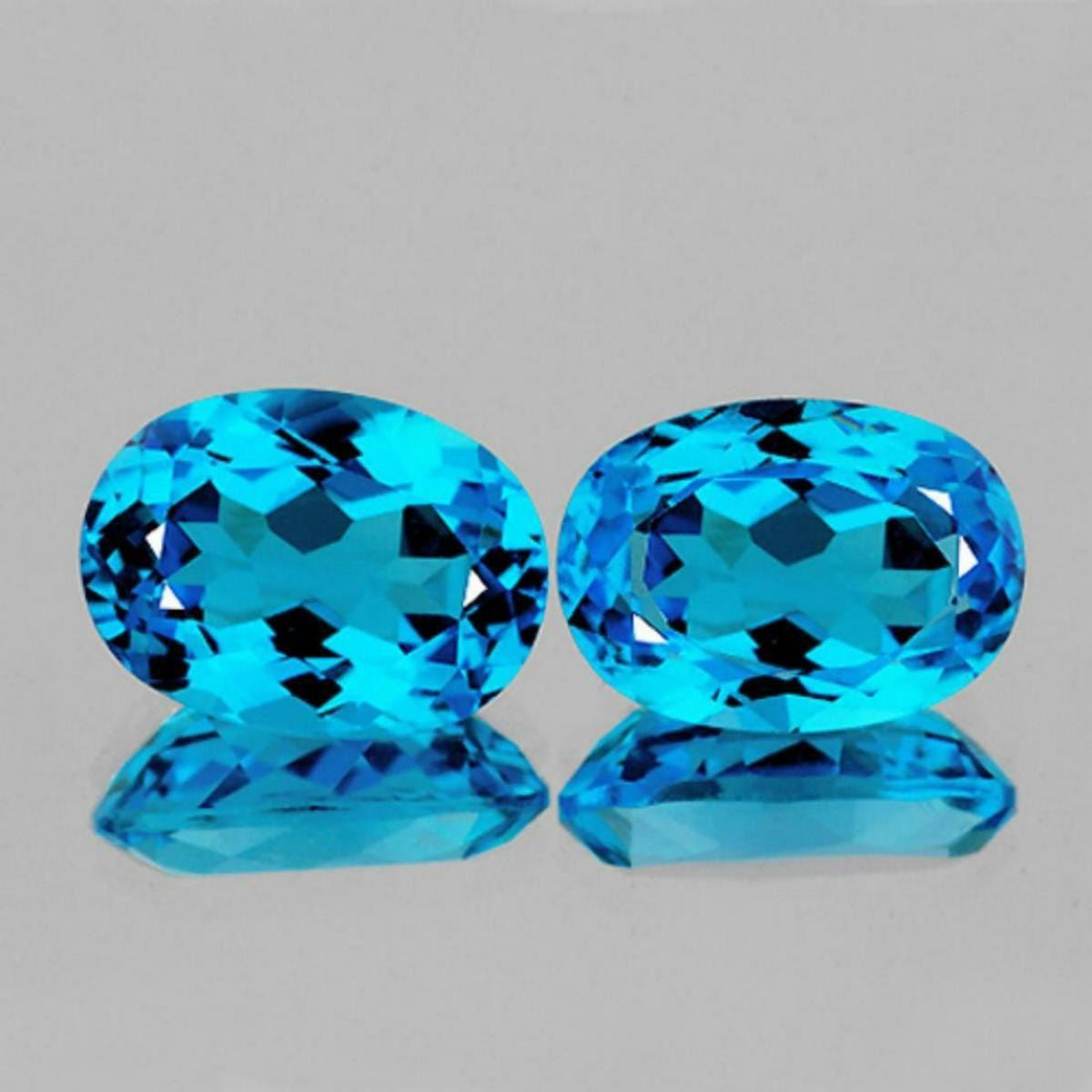 Natural Swiss Blue Topaz.......... WEIGHT : 13.55 Cts; SHAPE : Oval; SIZE ( L x W x D ) : 14.00 x 10.00 mm; QUANTITY : 2 pieces ( Perfectly Matched Pair ) COLOR : Baby Swiss Blue; CLARITY : VVS1; ORIGIN : Brazil; HARDNESS : 8; LUSTER : Excellent!!! TREATMENT : Heated
