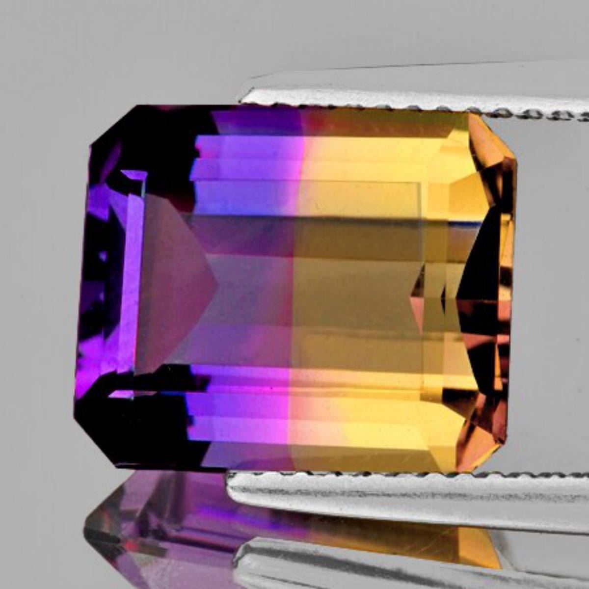 Natural Ametrine; WEIGHT : 11.30 cts; SHAPE : Rectangle; SIZE ( L x W x D ) : 14.84 x 11.70 x 7.90 mm QUANTITY : 1 piece;; COLOR : Bi-Color 50/50 Split; (Golden Yellow and Purple ) AAA Color; CLARITY : Flawless-VVS1 AAA Grade; ORIGIN : Boilvia; HARDNESS : 7; LUSTER : Excellent!!! TREATMENT : 100% Natural Unheated;