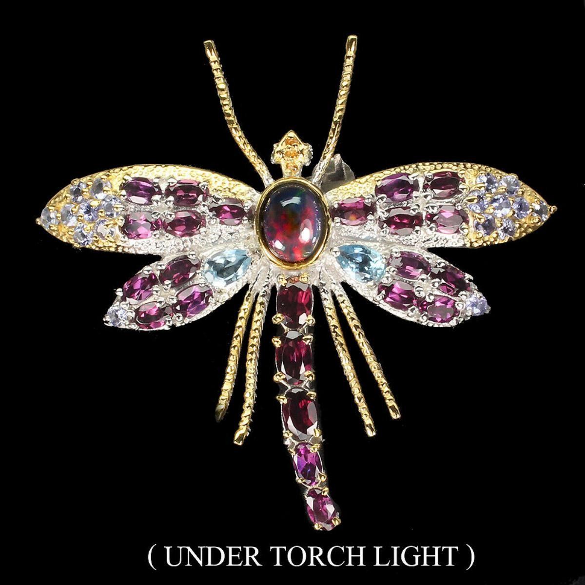 925 STERLING SILVER;PLATE-2-TONE WHITE & YELLOW 14K GOLD;MAIN STONE-BLACK OPAL;OTHER GEMS-AQUAMARINE, RHODOLITE GARNET, SAPPHIRE, TANZANITE;TOTAL WEIGHT-15.96 GRAM (TOTAL WEIGHT OF SILVER + STONE);DIMENSION-* STONE 1.5 TO 8.0 X 6.0 MM. * FACE BROOCH 60.0 X 57.0 MM.;MAIN STONE SHAPE-OVAL CABOCHON;MAIN STONE COLOR-HOT RAINBOW LUSTER;ORIGIN-ETHIOPIA;HARDNESS-5.5 - 6.5;