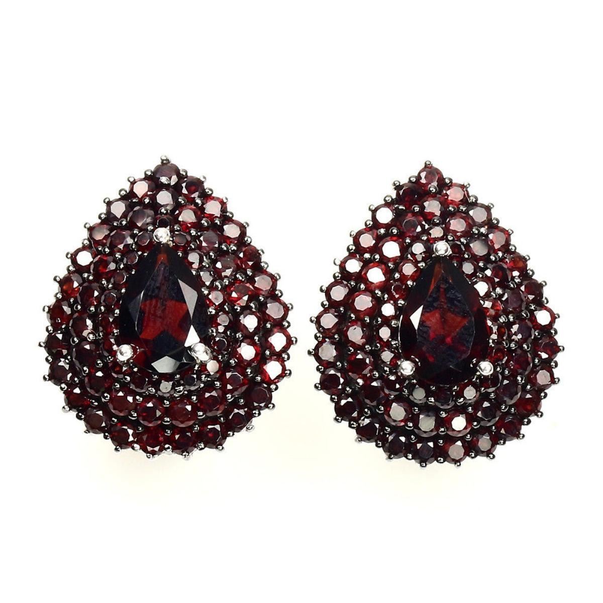925 STERLING SILVER ..... 2-TONE BLACK RHODIUM WHITE 14K GOLD Plated; MAIN STONE MOZAMBIQUE GARNET OTHER GEMS TOTAL WEIGHT 49.27 CT (TOTAL WEIGHT OF SILVER + STONE) DIMENSION * STONE 1.5 TO 9.0 X 6.0 MM. * FACE EARRINGS 22.0 X 18.0 MM. MAIN STONE SHAPE PEAR CUT MAIN STONE COLOR TOP BLACK RED CLARITY/GRADE IF TO VVS LUSTER EXQUISITE TREATMENT UNHEATED ORIGIN AFRICA HARDNESS 7.0 - 7.5