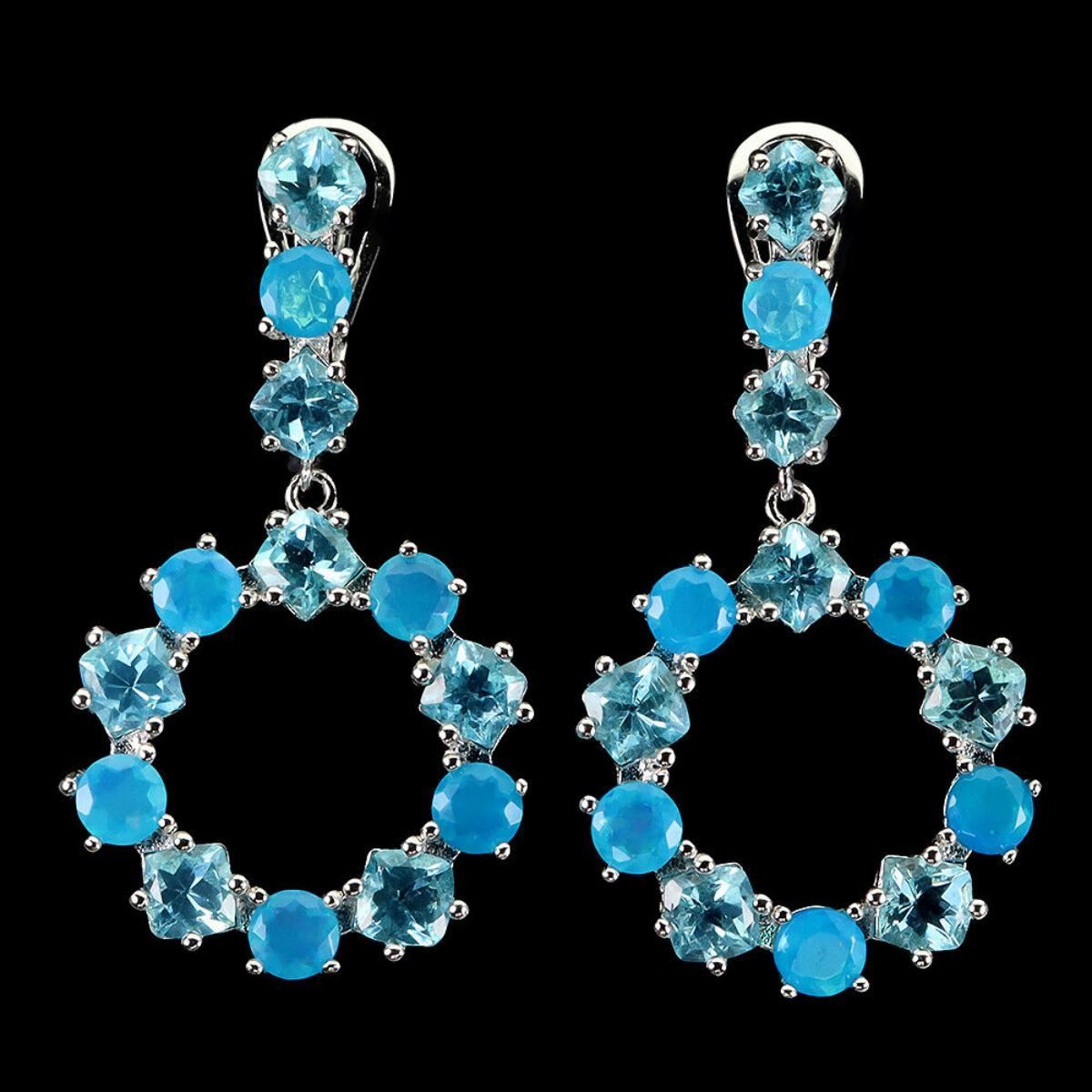 925 STERLING SILVER; PLATE- 14K WHITE GOLD; MAIN STONE- APATITE; OTHER GEMS- BLUE OPAL; TOTAL WEIGHT- 8.97 GRAM (TOTAL WEIGHT OF SILVER + STONE) DIMENSION * STONE 4.0 MM. * FACE EARRINGS 40.0 X 21.0 MM.; MAIN STONE SHAPE- CUSHION CUT; MAIN STONE COLOR- TOP NEON BLUE; CLARITY/GRADE- IF TO VVS; TREATMENT- UNHEATED; ORIGIN- AFRICA; HARDNESS- 5;
