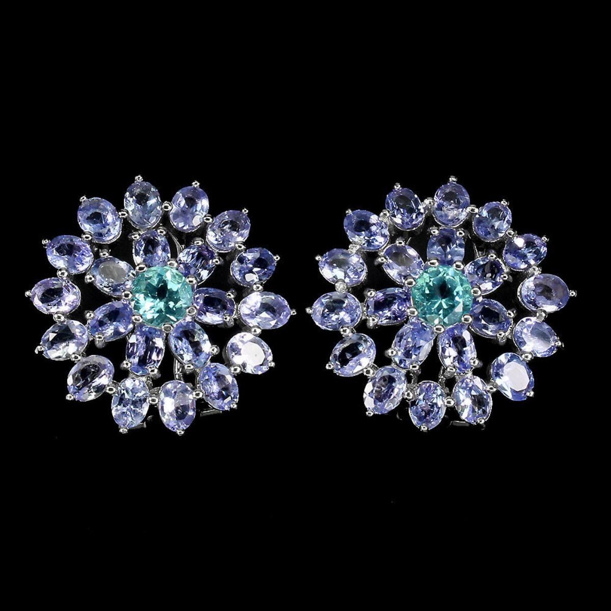 925 STERLING SILVER;PLATE-14K WHITE GOLD;MAIN STONE-APATITE;OTHER GEMS-TANZANITE;TOTAL WEIGHT-9.83 GRAM (TOTAL WEIGHT OF SILVER + STONE)DIMENSION-* STONE 4.0 X 3.0 TO 5.0 MM.* FACE EARRINGS- 22.0 X 22.0 MM.;MAIN STONE SHAPE-ROUND CUT;MAIN STONE COLOR-TOP NEON BLUE;CLARITY/GRADE-IF TO VVS;TREATMENT-UNHEATED;ORIGIN-AFRICA;HARDNESS-5;