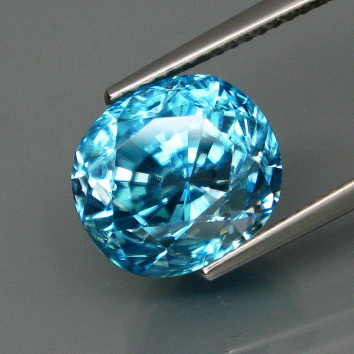 Blue Zircon SHAPE Oval WEIGHT10.66 Ct. SIZE 11.3 X 10.1 X 9 mm ; QUANTITY 1 Piece ; COLOR Blue; CLARITY VS ; LUSTER Superior ; ORIGIN Cambodia TREATMENT unHeated ; HARDNESS6-7.5