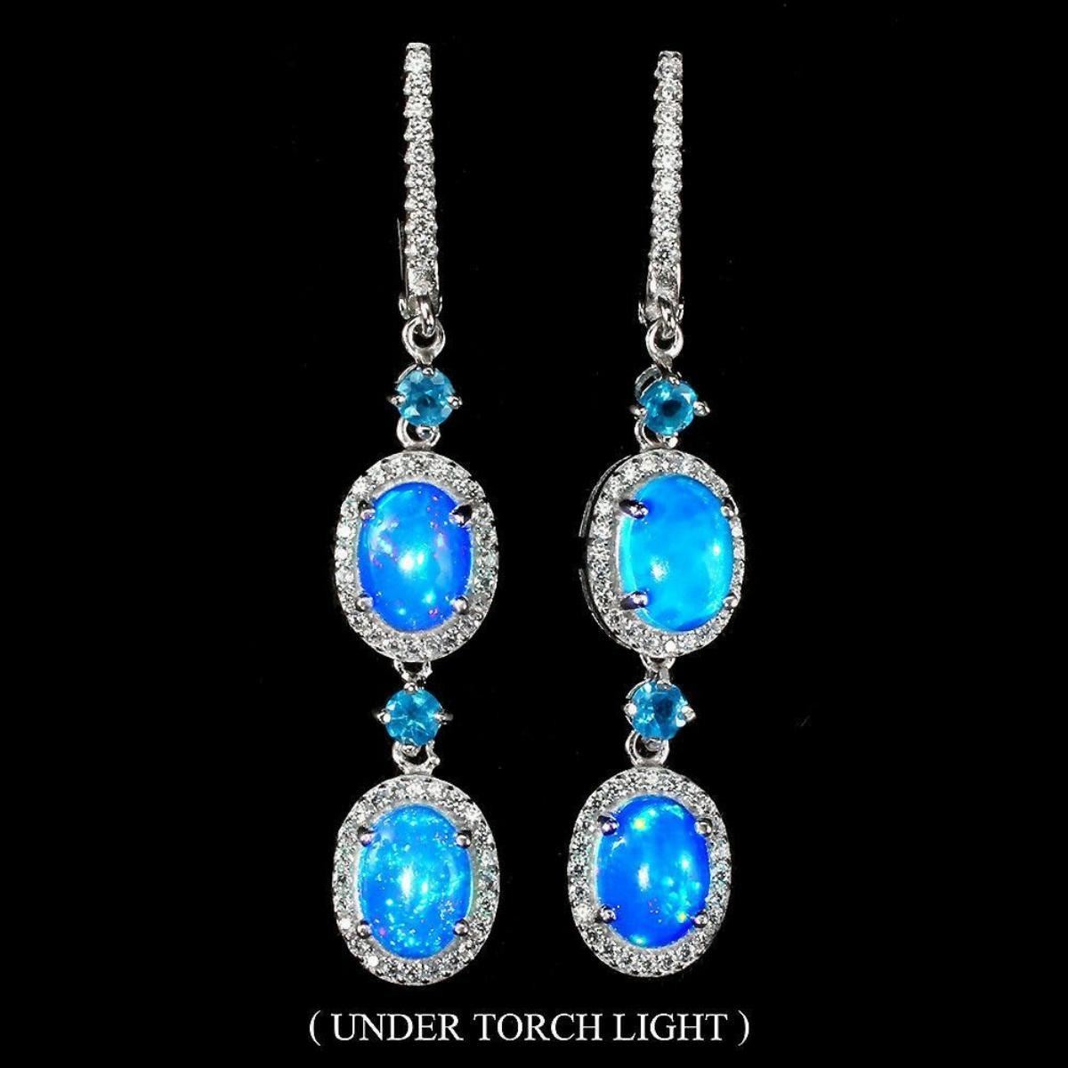 925 STERLING SILVER;PLATE-14K WHITE GOLD;MAIN STONE-BLUE FIRE OPAL;OTHER GEMS-APATITE, ;TOTAL WEIGHT-7.39 GRAM (TOTAL WEIGHT OF SILVER + STONE)DIMENSION-* STONE 3.0 TO 8.0 X 6.0 MM. * CZ 1.0 MM. * FACE EARRINGS- 11.0 X 9.0 MM.;MAIN STONE SHAPE-OVAL CABOCHON;MAIN STONE COLOR-TOP RICH BLUE;CLARITY/GRADE-TRANSPARENT;ORIGIN-ETHIOPIA, BRAZIL;HARDNESS-5.5 - 6.5