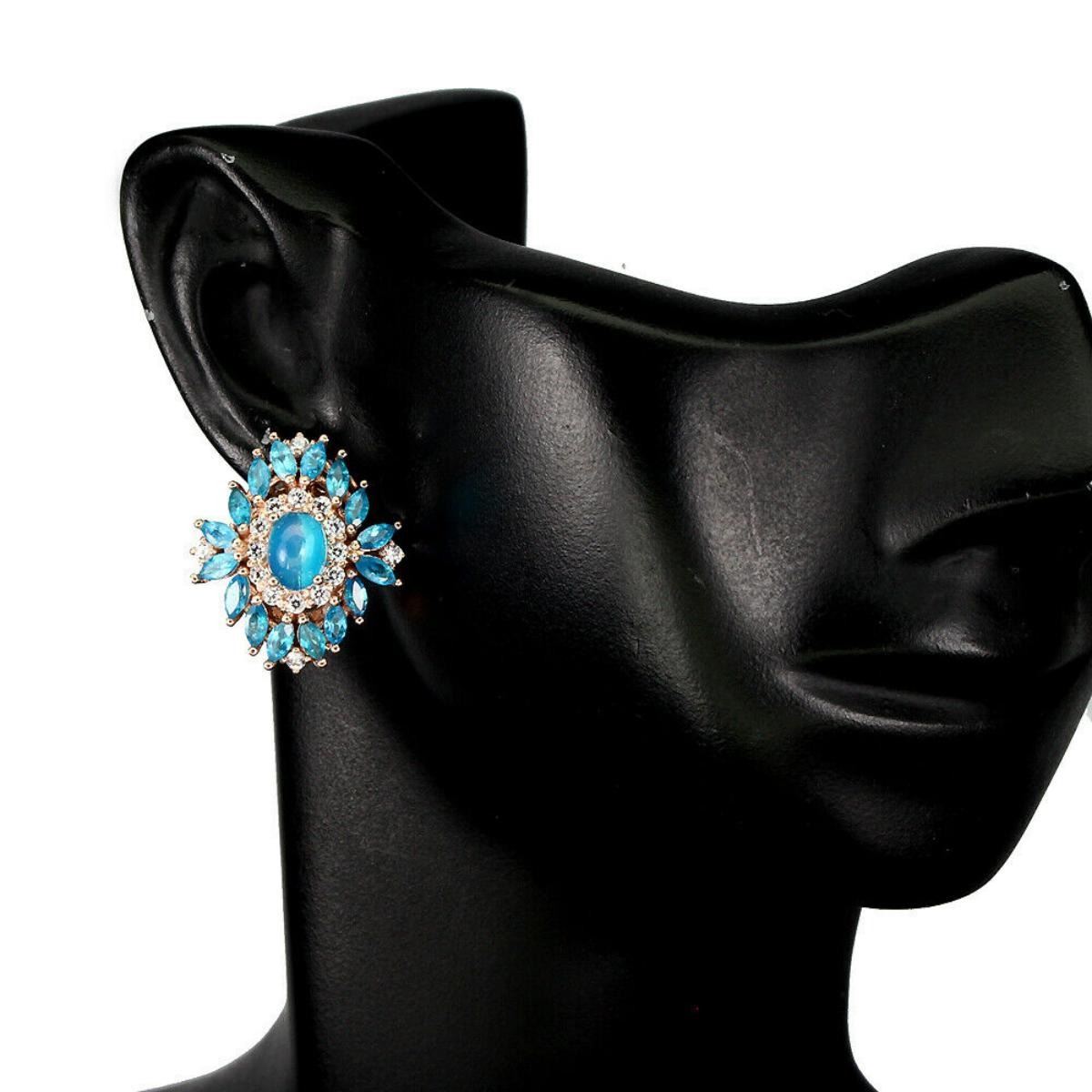 925 STERLING SILVER;PLATE-14K ROSE GOLD;MAIN STONE-BLUE FIRE OPAL;OTHER GEMS-APATITE, CUBIC ZIRCONIA;TOTAL WEIGHT-8.36 GRAM (TOTAL WEIGHT OF SILVER + STONE)DIMENSION* STONE 4.0 X 2.0 TO 7.0 X 5.0 MM. * FACE EARRINGS 22.0 X 19.0 MM.;MAIN STONE SHAPE-OVAL CABOCHON;MAIN STONE COLOR-TOP RICH BLUE;CLARITY/GRADE-IF TO VVS;ORIGIN-ETHIOPIA & Brazil;HARDNESS-5