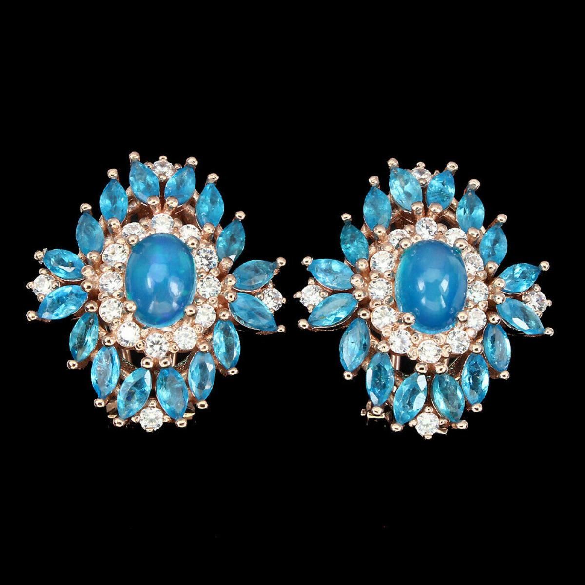 925 STERLING SILVER;PLATE-14K ROSE GOLD;MAIN STONE-BLUE FIRE OPAL;OTHER GEMS-APATITE, CUBIC ZIRCONIA;TOTAL WEIGHT-8.36 GRAM (TOTAL WEIGHT OF SILVER + STONE)DIMENSION* STONE 4.0 X 2.0 TO 7.0 X 5.0 MM. * FACE EARRINGS 22.0 X 19.0 MM.;MAIN STONE SHAPE-OVAL CABOCHON;MAIN STONE COLOR-TOP RICH BLUE;CLARITY/GRADE-IF TO VVS;ORIGIN-ETHIOPIA & Brazil;HARDNESS-5