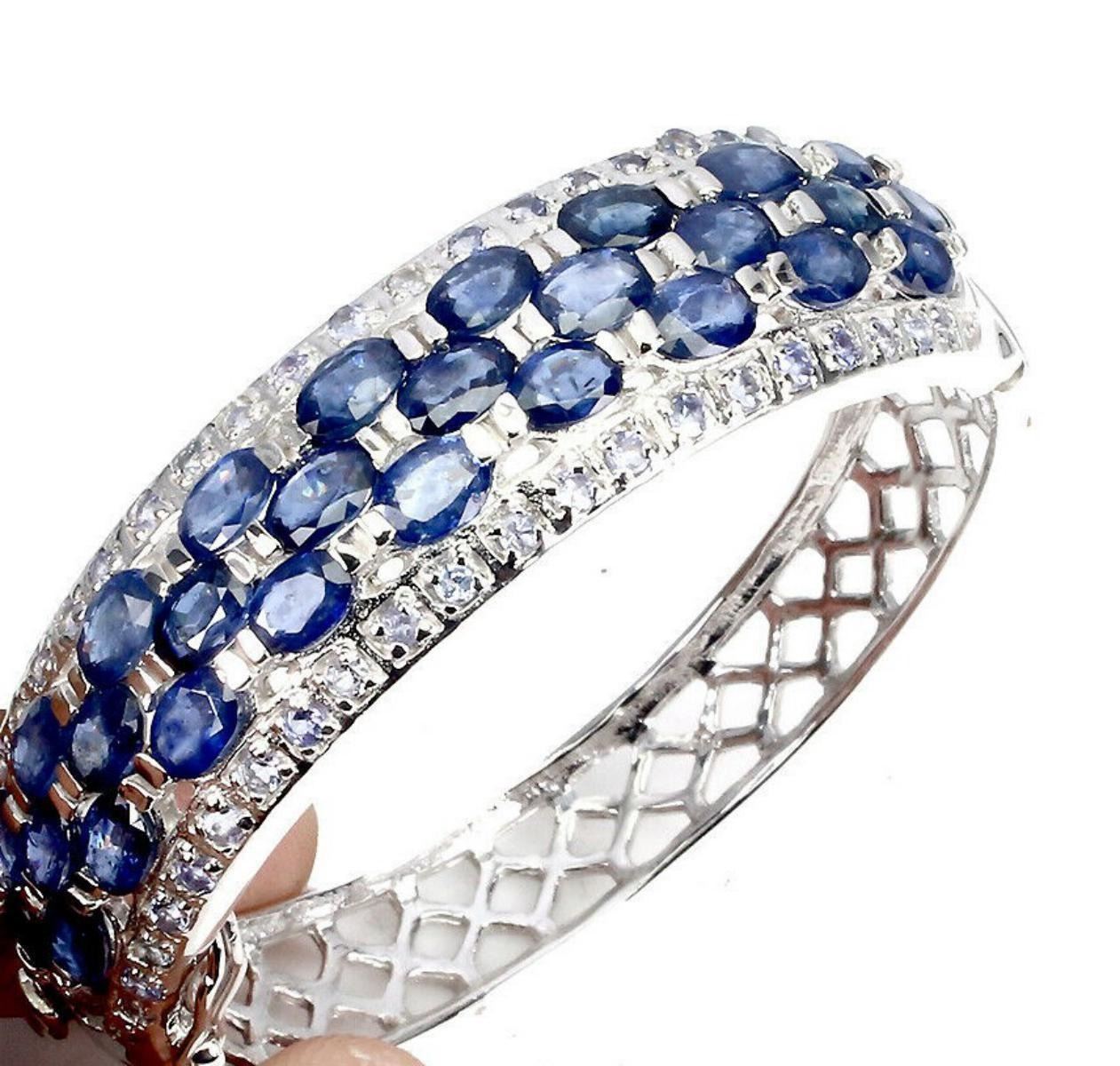 Natural Blue Sapphire 6x4 MM & Tanzanite Bangle............TYPE OF METAL-925 sterling silver;PLATE-14k White Gold;MAIN STONE-Sapphire;OTHER GEMS-Tanzanite;TOTAL weight-24.87 gram (total weight of silver + stone)DIMENSION-* STONE 2.0 TO 6.0 X 4.0 MM. * DIAMETER 2.0 X 1.9 INCHES. * FACE BANGLE 58.0 X 17.0 MM.;MAIN STONE SHAPE-Oval Cut;MAIN STONE COLOR-Top Rich Blue;CLARITY/GRADE-Transparent;ORIGIN-Africa;HARDNESS-9;