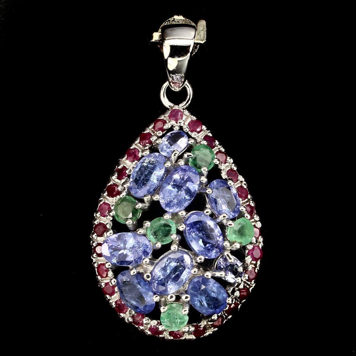 925 STERLING SILVER;PLATE....14K WHITE GOLD;MAIN STONE-TANZANITE;OTHER GEMS-EMERALD,RUBY.TOTAL WEIGHT27.62 CT (TOTAL WEIGHT OF SILVER + STONE)DIMENSION* STONE 2.0 TO 6.0 X 4.0 MM. * FACE PENDANT 39.0 X 20.0 MM.MAIN STONE SHAPE-OVAL CUT;MAIN STONE COLOR-TOP NICE BLUE VIOLET;CLARITY/GRADEIF TO VVS;LUSTERGORGEOUS;TREATMENTUNHEATED;ORIGINTANZANIA - AFRICA;HARDNESS7.0 - 7.5;