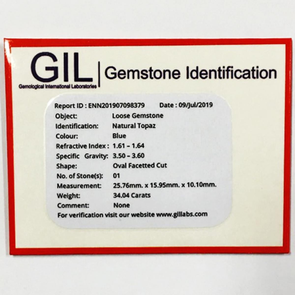 Natural Topaz (Certified) WEIGHT : 34.04 cts; SHAPE : Oval; SIZE ( L x W x D ) : 25.76 x 15.95 x 10.10 mm; QUANTITY : 1 piece COLOR : Blue (Natural Color) CLARITY : Flawless-VVS1 AAA Grade;; ORIGIN : Brazil; HARDNESS : 8; LUSTER : Excellent!!! TREATMENT : Unheated & Untreated 100% Natural;