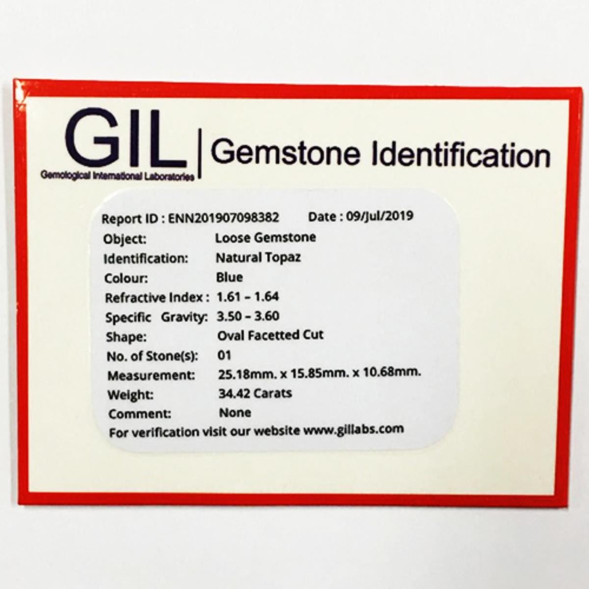 Natural Topaz (Certified) WEIGHT : 34.42 cts; SHAPE : Oval; SIZE ( L x W x D ) : 25.18 x 15.85 x 10.68 mm; QUANTITY : 1 piece COLOR : Blue (Natural Color) CLARITY : Flawless-VVS1 AAA Grade; ORIGIN : Brazil; HARDNESS : 8; LUSTER : Excellent!!! TREATMENT : Unheated & Untreated 100% Natural;