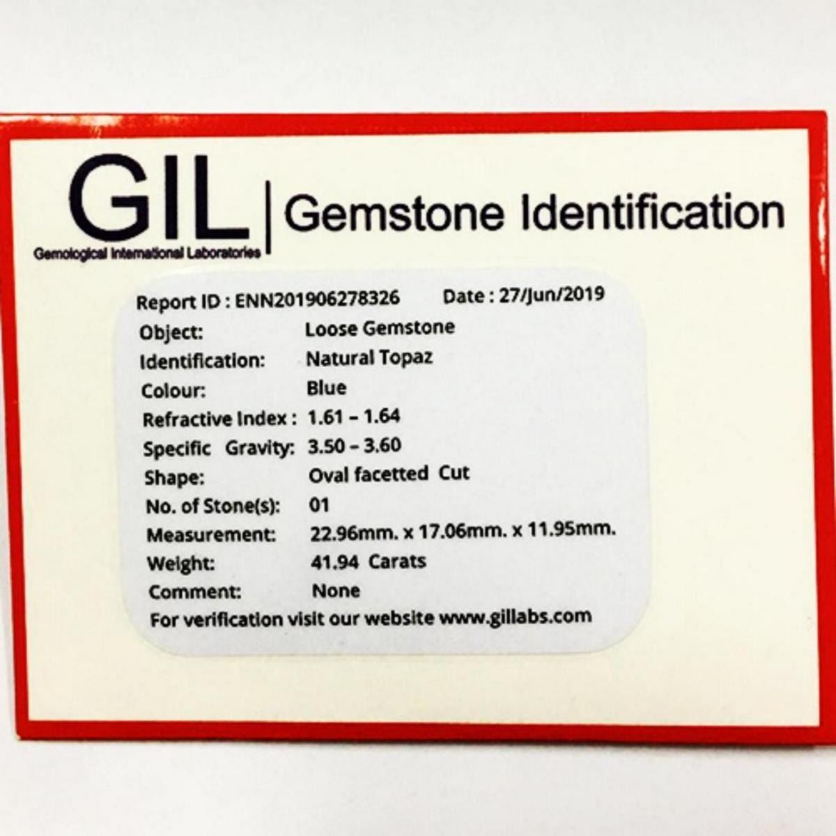 Natural Topaz Certified; WEIGHT : 41.94 cts; SHAPE : Oval SIZE ( L x W x D ) : 22.96 x 17.06 x 11.95 mm QUANTITY : 1 piece COLOR : Blue (Natural Color) CLARITY : Flawless-VVS1 AAA Grade ORIGIN : Brazil HARDNESS : 8 LUSTER : Excellent!!! TREATMENT : Unheated & Untreated 100% Natural