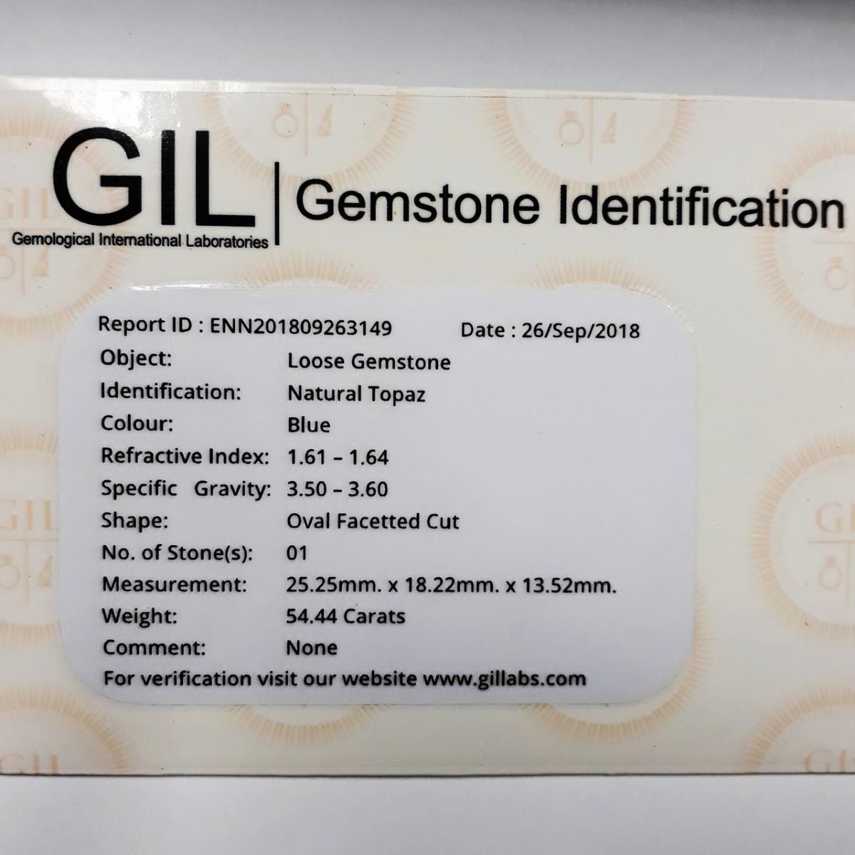 Natural Topaz WEIGHT : 54.44 cts; SHAPE : Oval; SIZE ( L x W x D ) : 25.25 x 18.22 x 13.52 mm; QUANTITY : 1 piece; COLOR : Light Blue (Natural Color) CLARITY : Flawless-VVS1 AAA Grade; ORIGIN : Brazil; HARDNESS : 8; LUSTER : Excellent!!! TREATMENT : Unheated & Untreated 100% Natural;