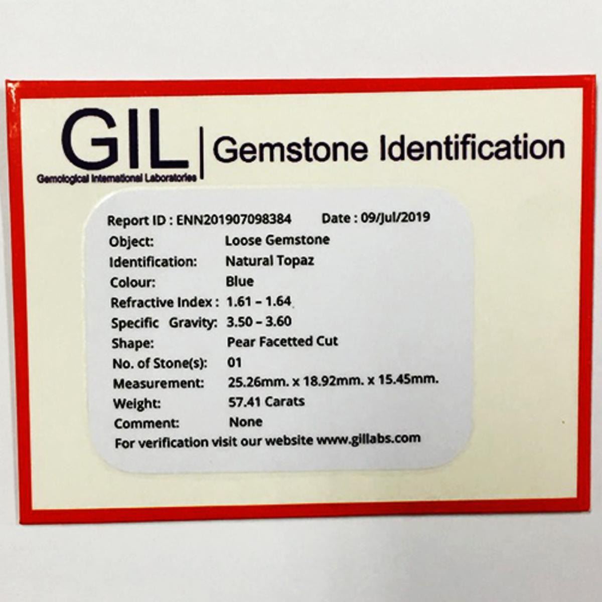 Natural Topaz (Certified) WEIGHT : 57.41 cts; SHAPE : Oval; SIZE ( L x W x D ) : 25.26 x 18.92 x 15.45 mm; QUANTITY : 1 piece; COLOR : Blue (Natural Color) CLARITY : Flawless-VVS1 AAA Grade; ORIGIN : Brazil; HARDNESS : 8; LUSTER : Excellent!!! TREATMENT : Unheated & Untreated 100% Natural;