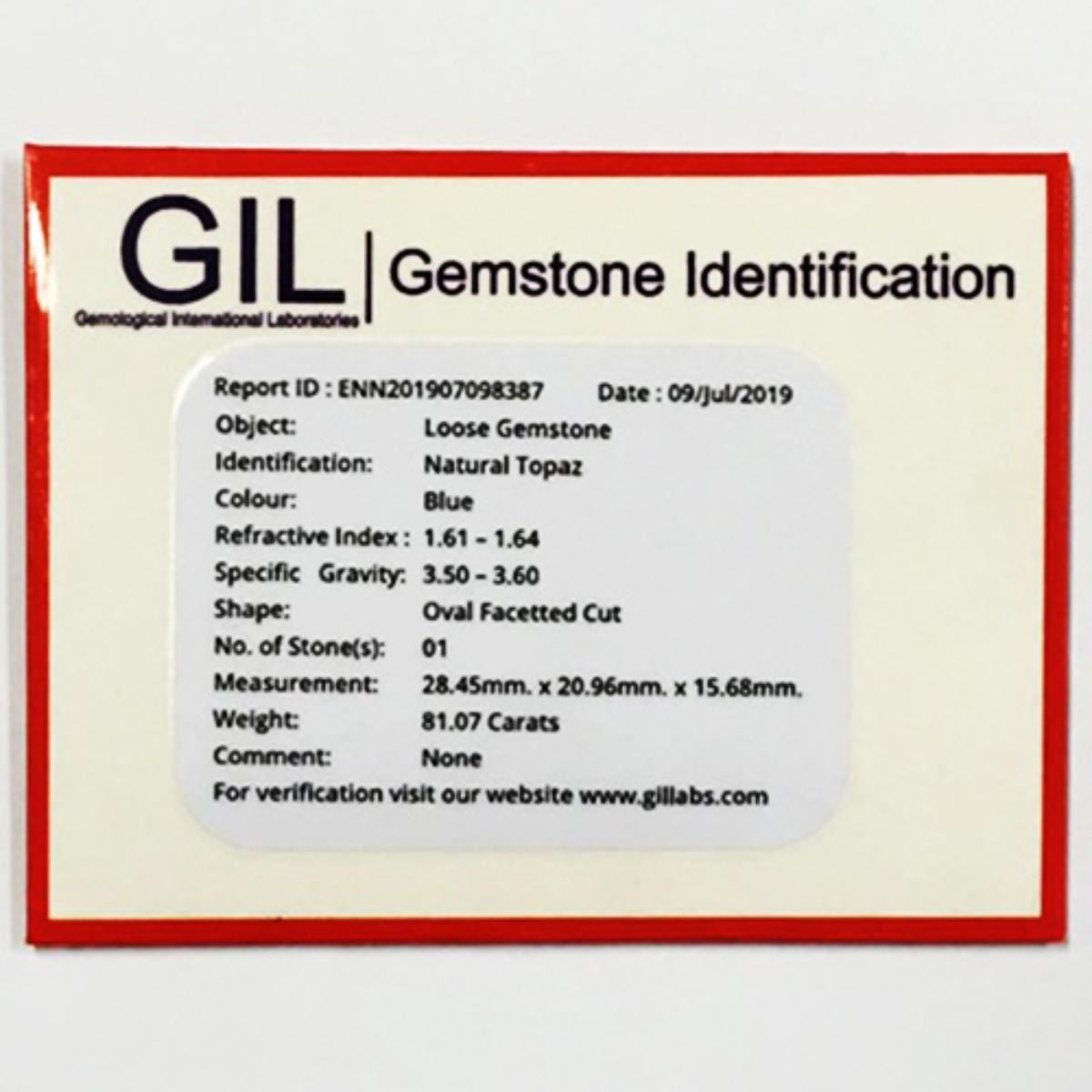 Natural Topaz ( Certified ) WEIGHT : 81.07 cts; SHAPE : Oval; SIZE ( L x W x D ) : 28.45 x 20.96 x 15.68 mm; QUANTITY : 1 piece COLOR : Blue (Natural Color) CLARITY : Flawless-VVS1 AAA Grade; ORIGIN : Brazil; HARDNESS : 8; LUSTER : Excellent!!! TREATMENT : Unheated & Untreated 100% Natural;