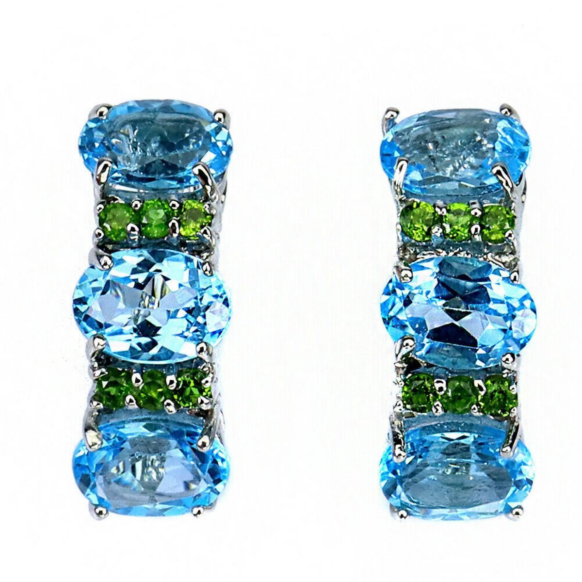 925 STERLING SILVER;PLATE-14K WHITE GOLD;MAIN STONE-SWISS BLUE TOPAZ;OTHER GEMS-CHROME DIOPSIDE;TOTAL WEIGHT-5.68 GRAM (TOTAL WEIGHT OF SILVER + STONE)DIMENSION* STONE 2.0 TO 7.0 X 5.0 MM. * FACE EARRINGS 19.0 X 7.0 MM.;MAIN STONE SHAPE-OVAL CUT;MAIN STONE COLOR- SWISS BLUE;CLARITY/GRADE-IF TO VVS;ORIGIN-AFRICA;HARDNESS-8;