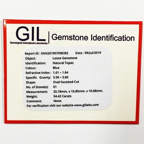 Natural Topaz (Certified) WEIGHT : 34.42 cts; SHAPE : Oval SIZE ( L x W x D ) : 25.18 x 15.85 x 10.68 mm QUANTITY : 1 piece COLOR : Blue (Natural Color) CLARITY : Flawless-VVS1 AAA Grade ORIGIN : Brazil HARDNESS : 8 LUSTER : Excellent!!! TREATMENT : Unheated & Untreated 100% Natural