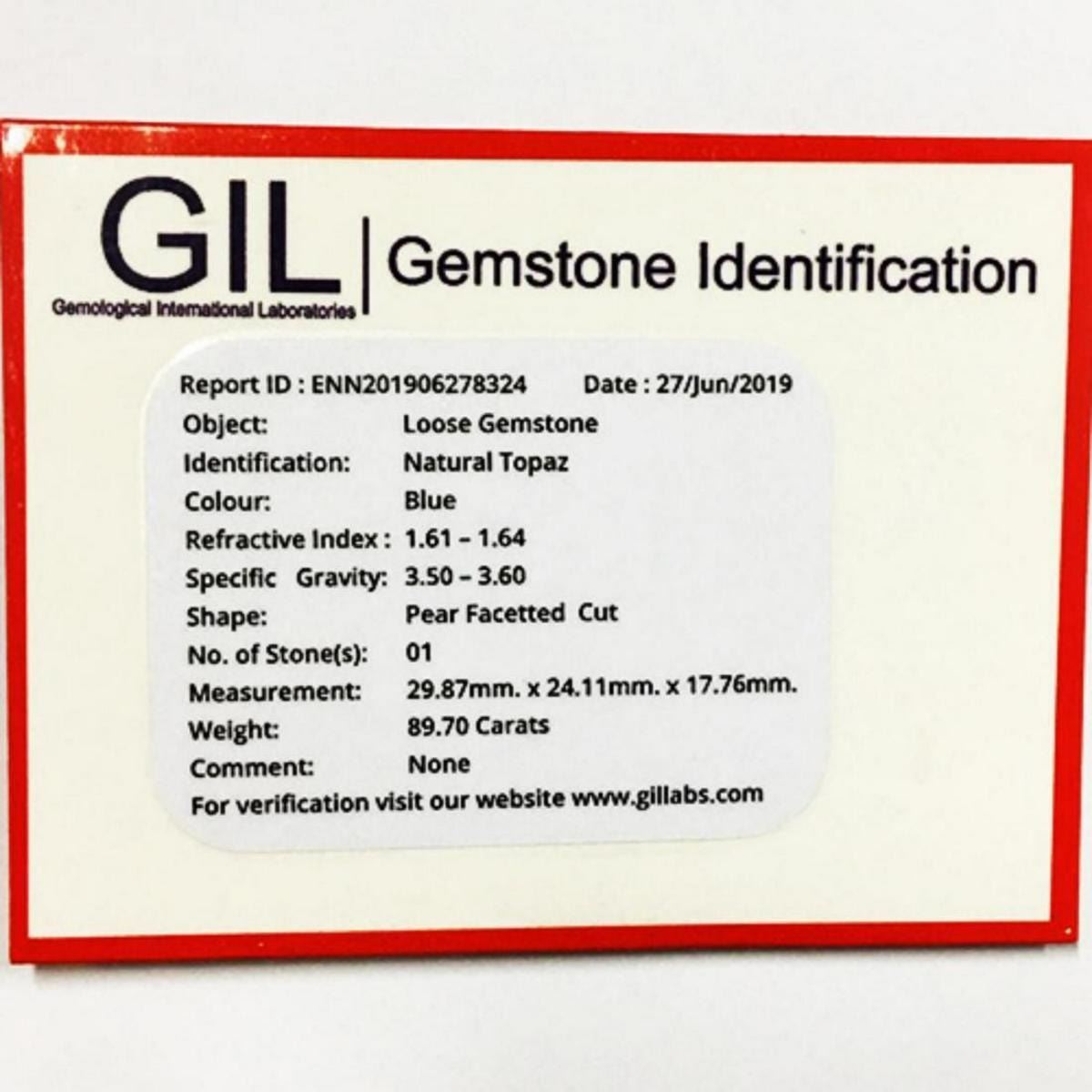 Natural Topaz (Certified) WEIGHT : 89.70 cts; SHAPE : Pear SIZE ( L x W x D ) : 29.87 x 24.11 x 17.76 mm QUANTITY : 1 piece COLOR : Blue (Natural Color) CLARITY : Flawless-VVS1 AAA Grade ORIGIN : Brazil HARDNESS : 8 LUSTER : Excellent!!! TREATMENT : Unheated & Untreated 100% Natural