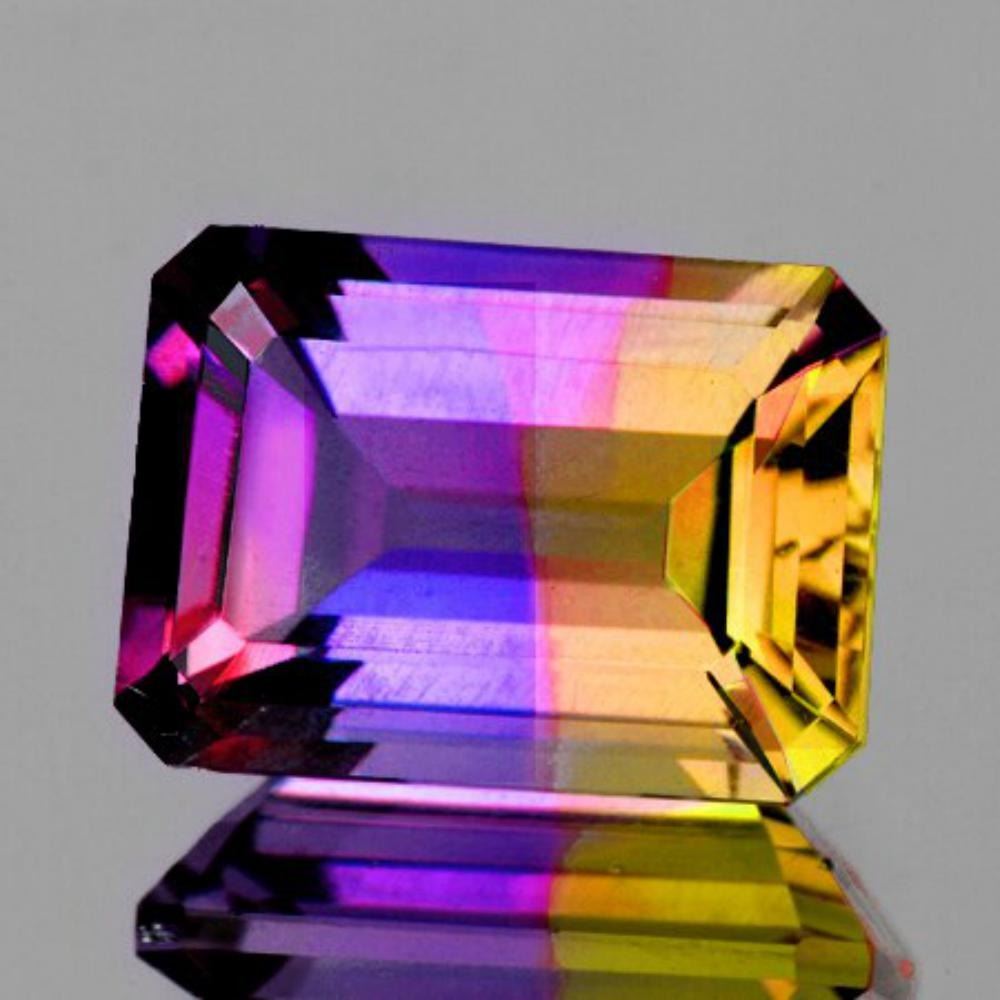 Natural Ametrine; WEIGHT : 8.57 cts; SHAPE : Rectangle; SIZE ( L x W x D ) : 14.34 x 10.66 x 7.07 mm; QUANTITY : 1 pieces; COLOR : Bi-Color 50/50 Split; (Golden Yellow and Purple ) AAA Color; CLARITY : Flawless-VVS1 AAA Grade; ORIGIN : Boilvia; HARDNESS : 7; LUSTER : Excellent!!! TREATMENT : 100% Natural Unheated;