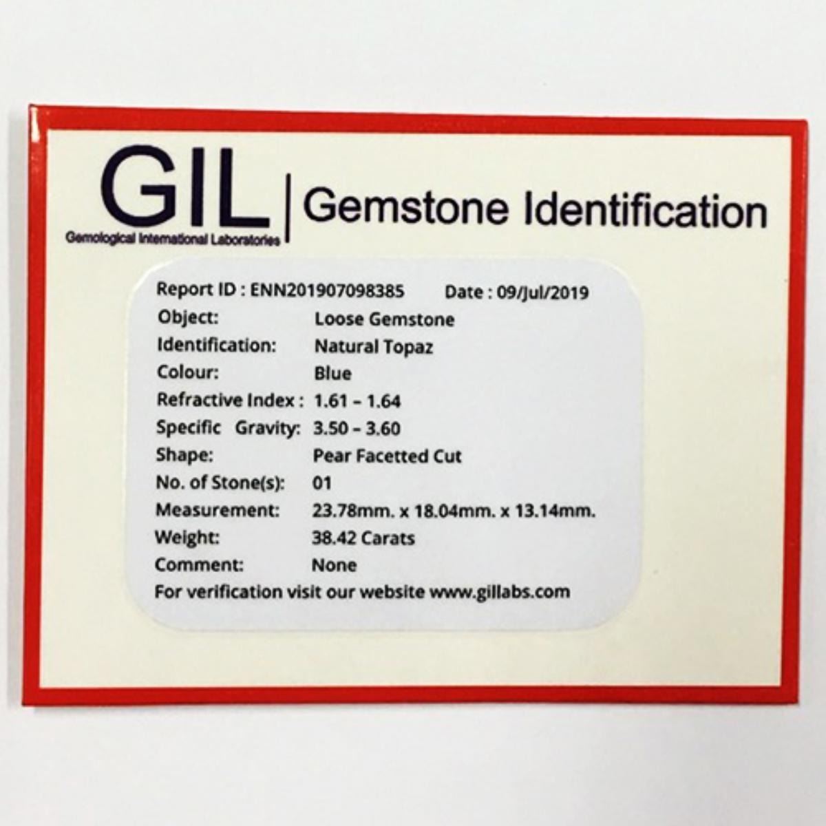 Natural Topaz.....Certified ; WEIGHT : 38.42 cts; SHAPE : Pear; SIZE ( L x W x D ) : 23.78 x 18.04 x 13.14 mm; QUANTITY : 1 piece; COLOR : Blue (Natural Color); CLARITY : Flawless-VVS1 AAA Grade; ORIGIN : Brazil; HARDNESS : 8; LUSTER : Excellent!!!; TREATMENT : Unheated & Untreated 100% Natural;