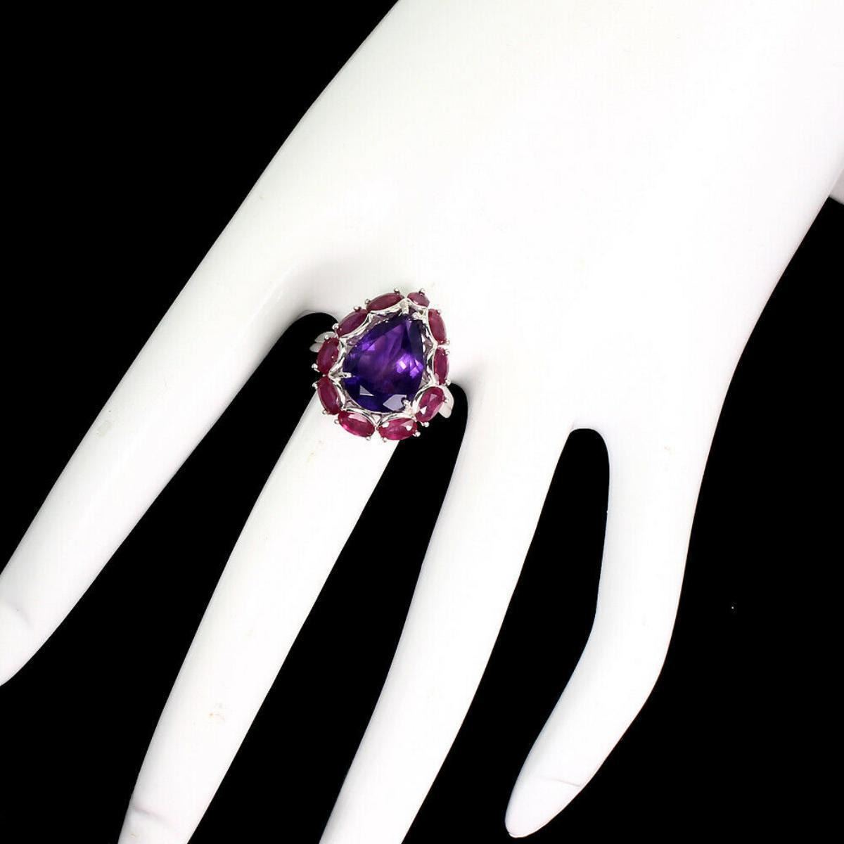 925 STERLING SILVER;;PLATE-14K WHITE GOLD;RING SIZE-8.5(resizeable);MAIN STONE-AMETHYST;OTHER GEMS-RUBY;TOTAL WEIGHT-5.43 GRAM (TOTAL WEIGHT OF SILVER + STONE)DIMENSION* STONE 3.0 TO 14.0 X 10.0 MM. * RING SIZE 8.5 * FACE RING -21.0 X 17.0 MM.;MAIN STONE SHAPE-PEAR CUT;MAIN STONE COLOR-TOP RICH PURPLE;CLARITY/GRADE-IF TO VVS;LUSTER-GORGEOUS;TREATMENTUNHEATED;ORIGIN-BRAZIL;HARDNESS-7.0 - 9.0;
