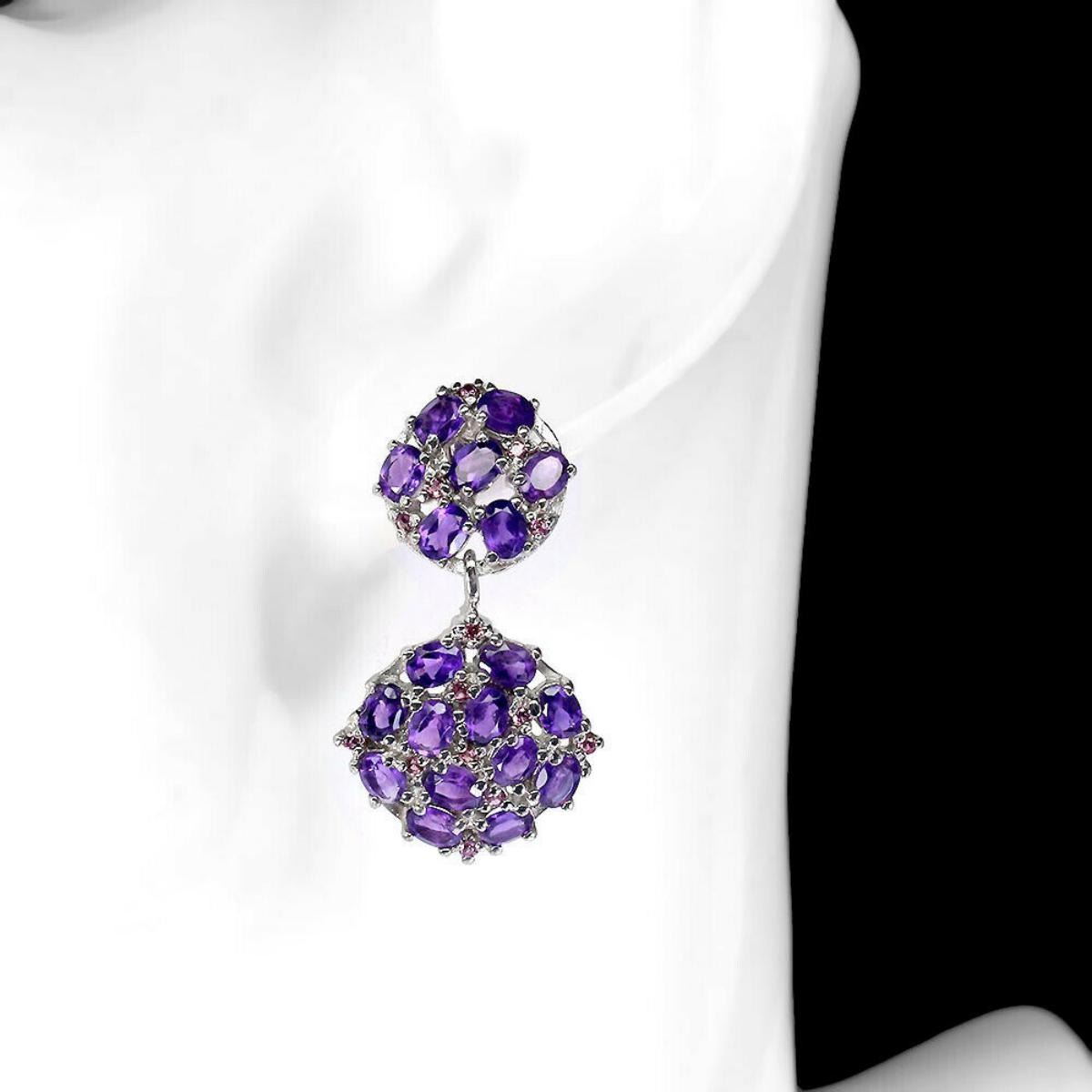 925 STERLING SILVER;PLATE-14K WHITE GOLD;MAIN STONE-AMETHYST;OTHER GEMS-RHODOLITE GARNET;TOTAL WEIGHT-7.83 GRAM (TOTAL WEIGHT OF SILVER + STONE)DIMENSION-* STONE 1.5 TO 4.0 X 3.0 MM. * FACE EARRINGS 35.0 X 19.0 MM.;MAIN STONE SHAPE-OVAL CUT;MAIN STONE COLOR-RICH PURPLE;CLARITY/GRADE-IF;TREATMENT-UNHEATED;ORIGIN-URUGUAY;HARDNESS-7;