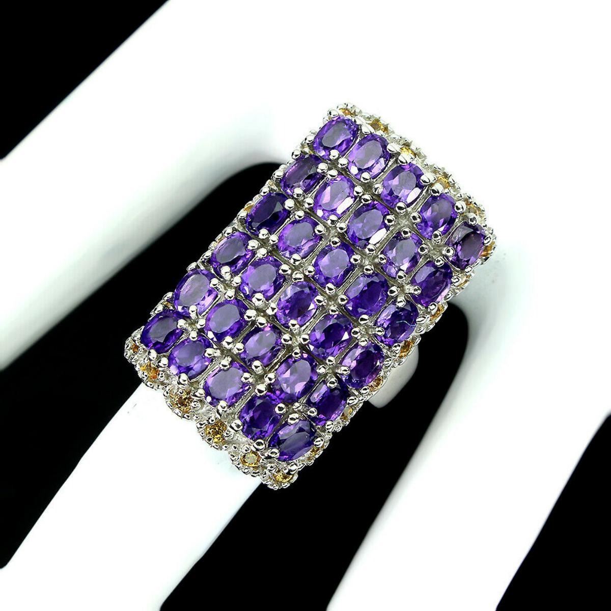 925 STERLING SILVERPLATE-14K WHITE GOLDRING SIZE/Resizeable-7.5MAIN STONE-AMETHYST;OTHER GEMS-SAPPHIRE;TOTAL WEIGHT-11.78 GRAM (TOTAL WEIGHT OF SILVER + STONE)DIMENSION-* STONE 1.5 TO 4.0 X 3.0 MM. * RING SIZE 7.5 * FACE RING -30.0 X 19.0 MM.;MAIN STONE SHAPE-OVAL CUT;MAIN STONE COLOR-TOP RICH PURPLE;CLARITY/GRADE-TRANSPARENT;TREATMENT-UNHEATEDlORIGIN-BRAZIL;HARDNESS-7;