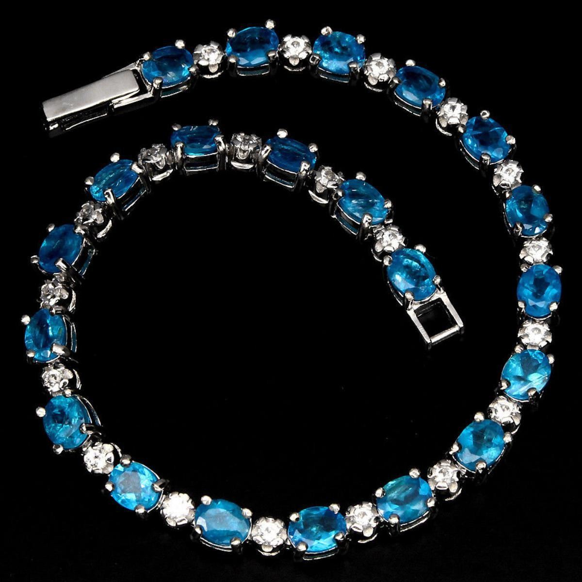 925 STERLING SILVER;PLATE14K WHITE GOLD;LENGTH (INCHES)8MAIN STONEAPATITE;OTHER GEMSCUBIC ZIRCONIA;TOTAL WEIGHT55.30 CT (TOTAL WEIGHT OF SILVER + STONE)DIMENSION* STONE 5.0 X 4.0 MM. * CZ 2.0 MM. * FACE BRACELET 180.0 X 4.0 MM.MAIN STONE SHAPEOVAL CUTMAIN STONE COLORTOP NEON BLUECLARITY/GRADEIF TO VVSLUSTERPRECIOUSORIGINBrazil;HARDNESS5.0